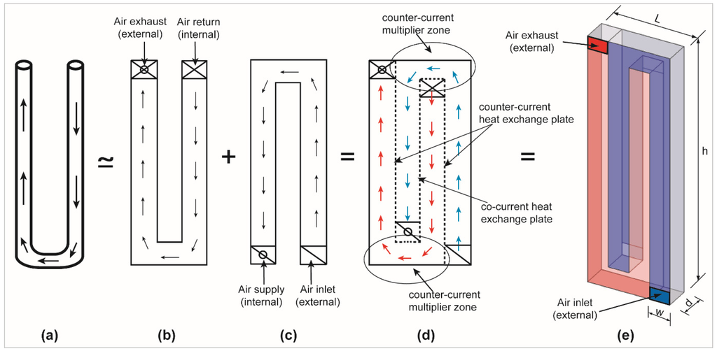 28]. In a counter-current multiplier zone, an elbow in the duct leads to pressure drop, which enhances the heat exchange process between the streams of air.