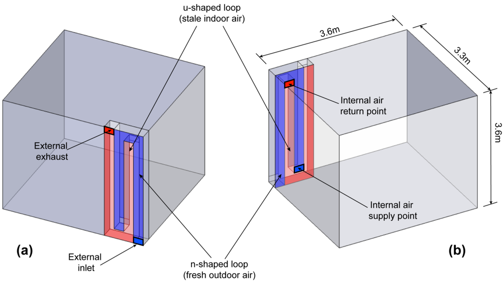 Figure 2a) but is transformed into a four-sided channel. Buoyant indoor air would be forced (by mass balance) to exit the space from a high-level return vent in the U-shape channel before it is exhausted at another high-level external vent in the same channel (