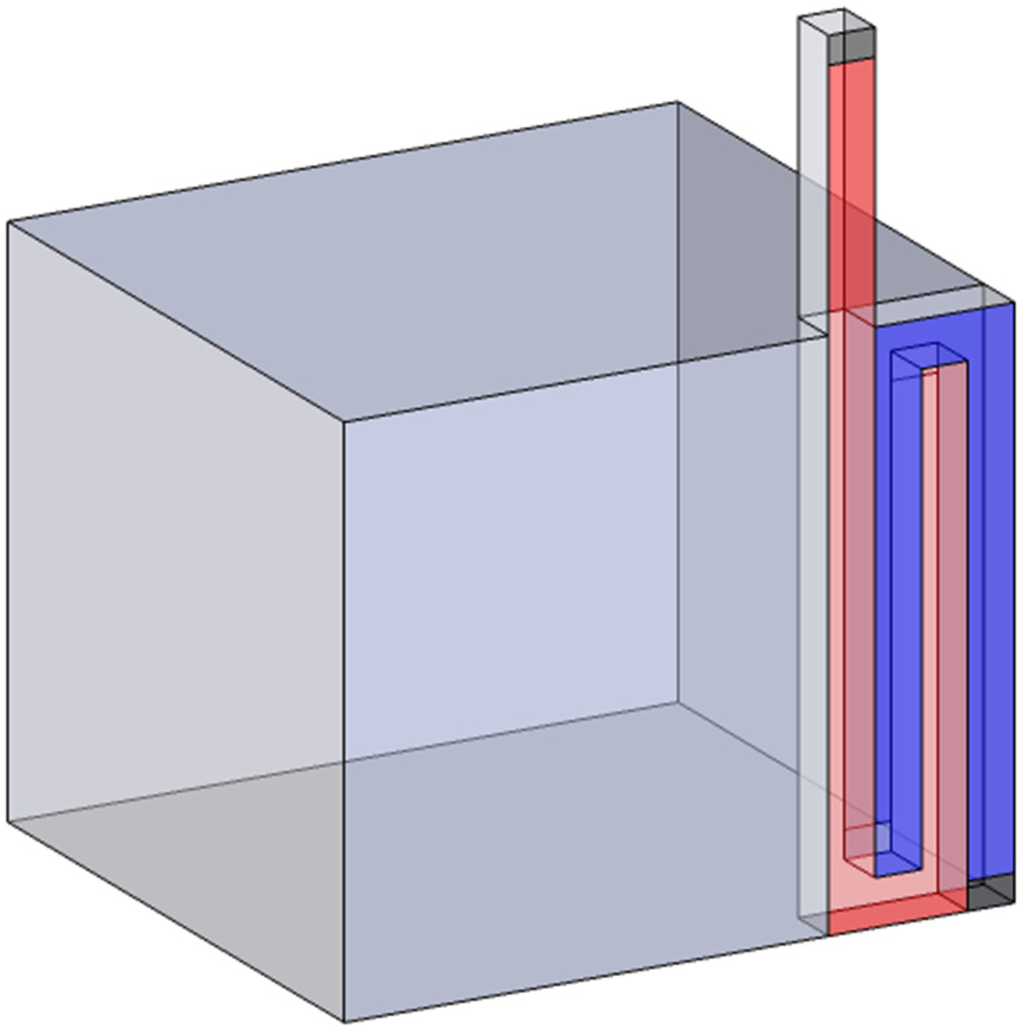 Figure 2e). Heat exchange is primarily expected to occur across the inner surface (plates) which connect the “U” and “∩” channels. However, the room-side surface of the ∩-shaped supply Chamber is also made of the highly conductive material. This is to encourage the transfer of heat from the warm air in the room to the cooler air in the supply Chamber. Specific dimensions of the LoH Chamber are given in the subsequent section.