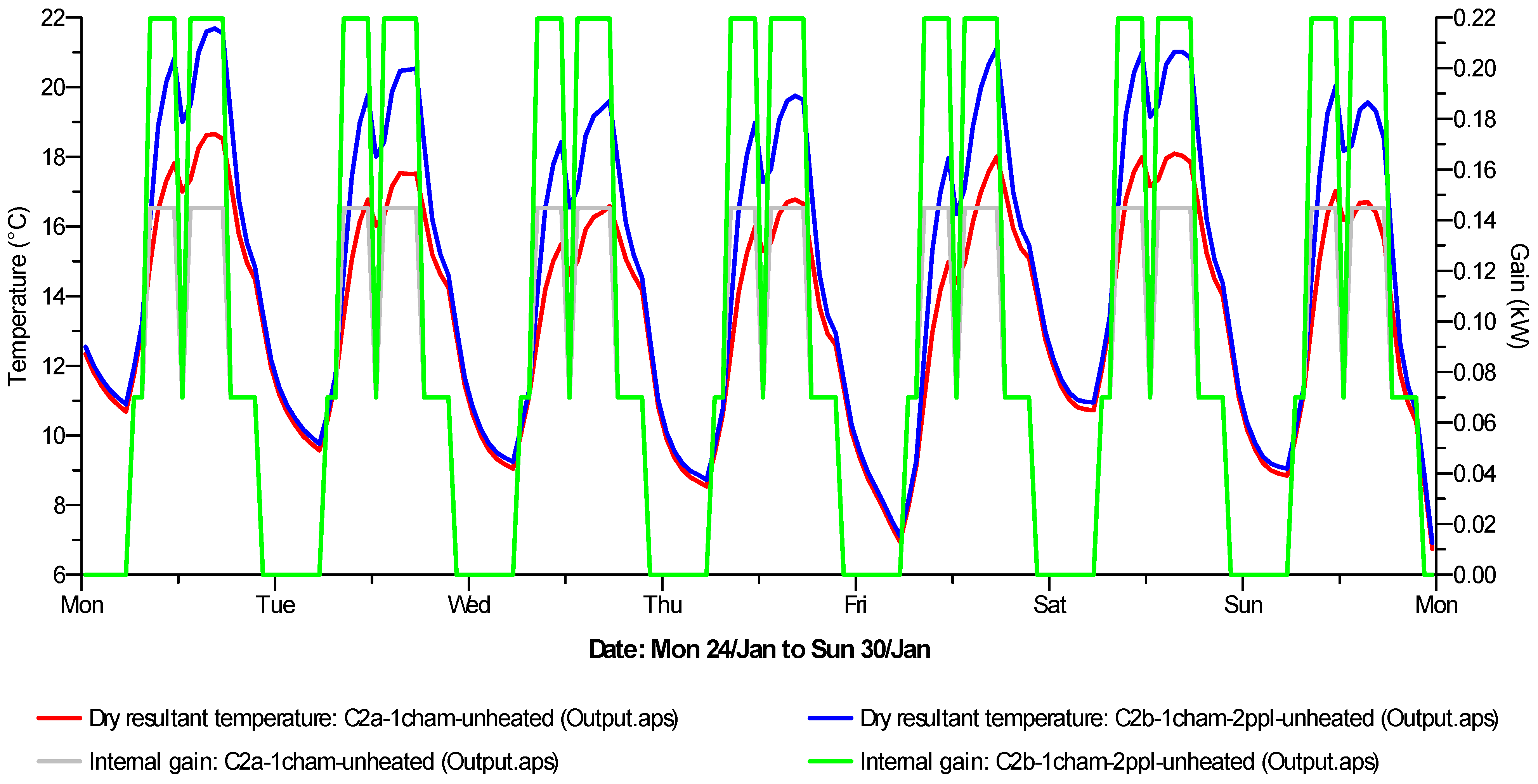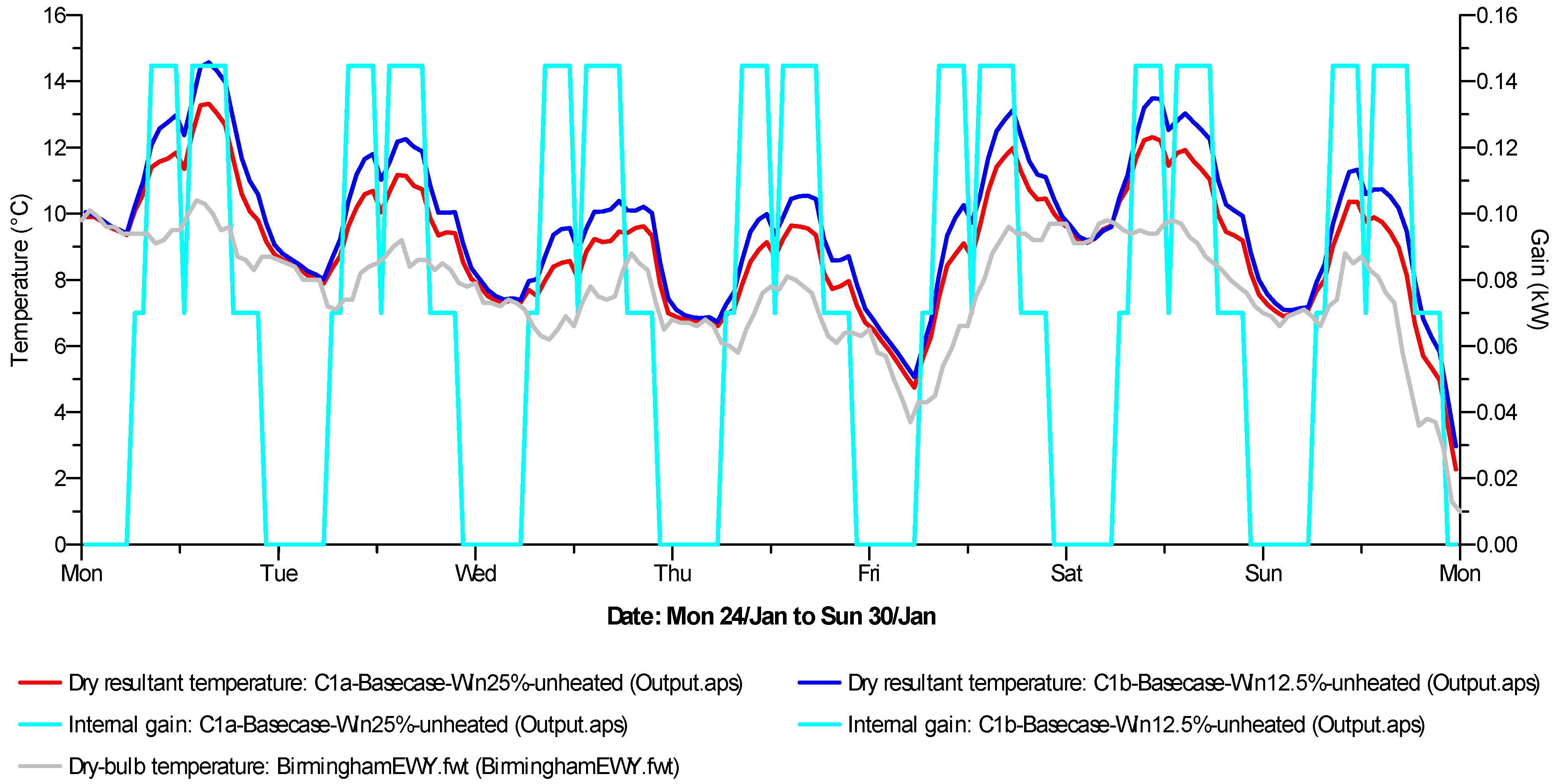 In addition to fluctuations in outdoor temperature (Figure 5), the internal gains also have strong influence on the pattern of indoor dry resultant temperature (DRT), as shown in Case 1a and Case 1b for a selected week: Monday 24 January to Sunday 30 January (Figure 6).