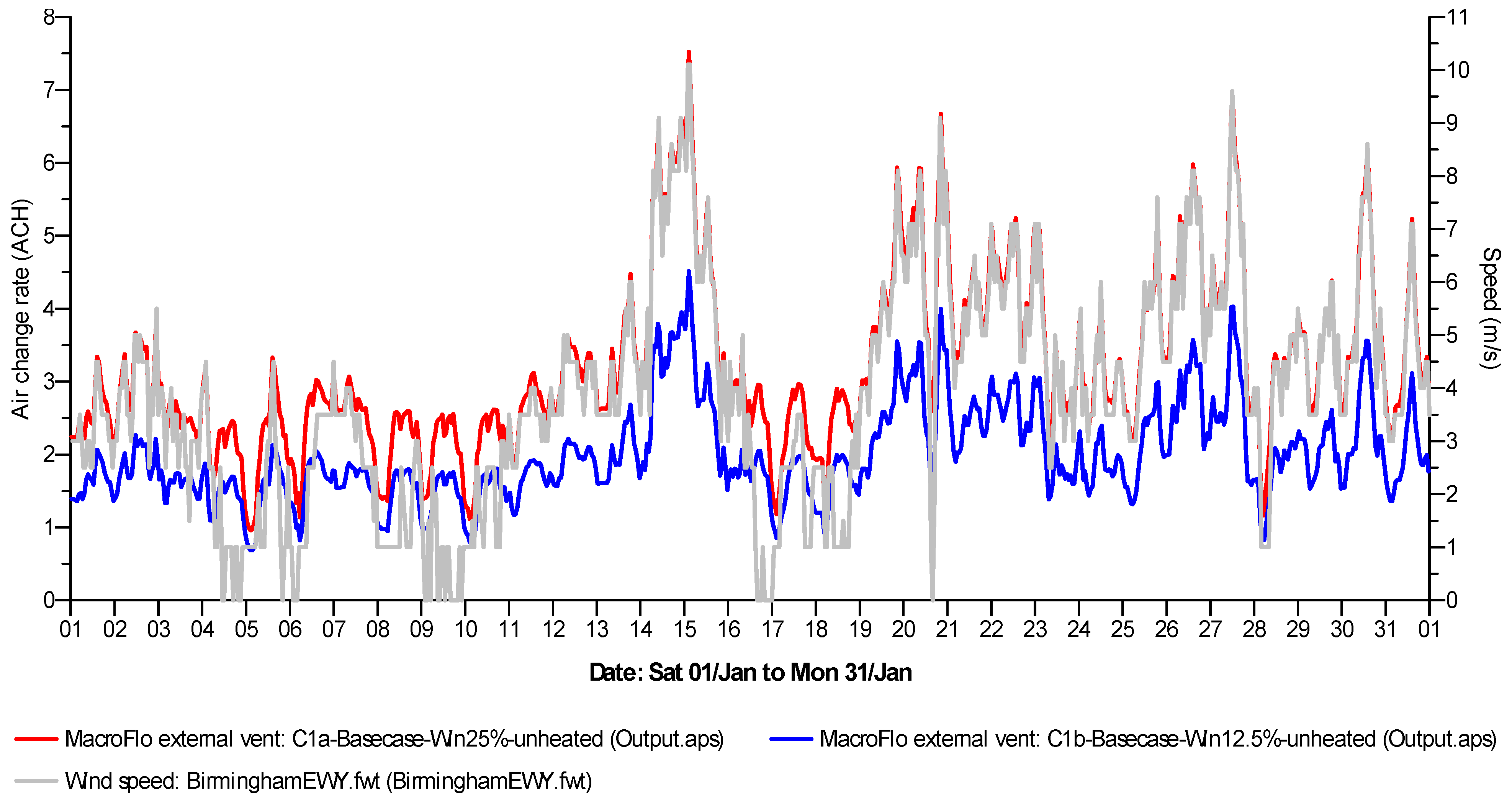 The fluctuations in airflow and the relative ventilation rates achieved by these base cases are primarily determined by wind, whose monthly mean speed is 3.89 m/s (Figure 7). At 25% opening fraction, the mean airflow into Case 1a is 3.21 ACH and at 12.5% opening fraction, this rate drops to 2.0 ACH. These airflow rates can rise up to maximum values of 7.52 ACH for Case 1a, and up to 4.51 ACH for Case 1b (Table 2).