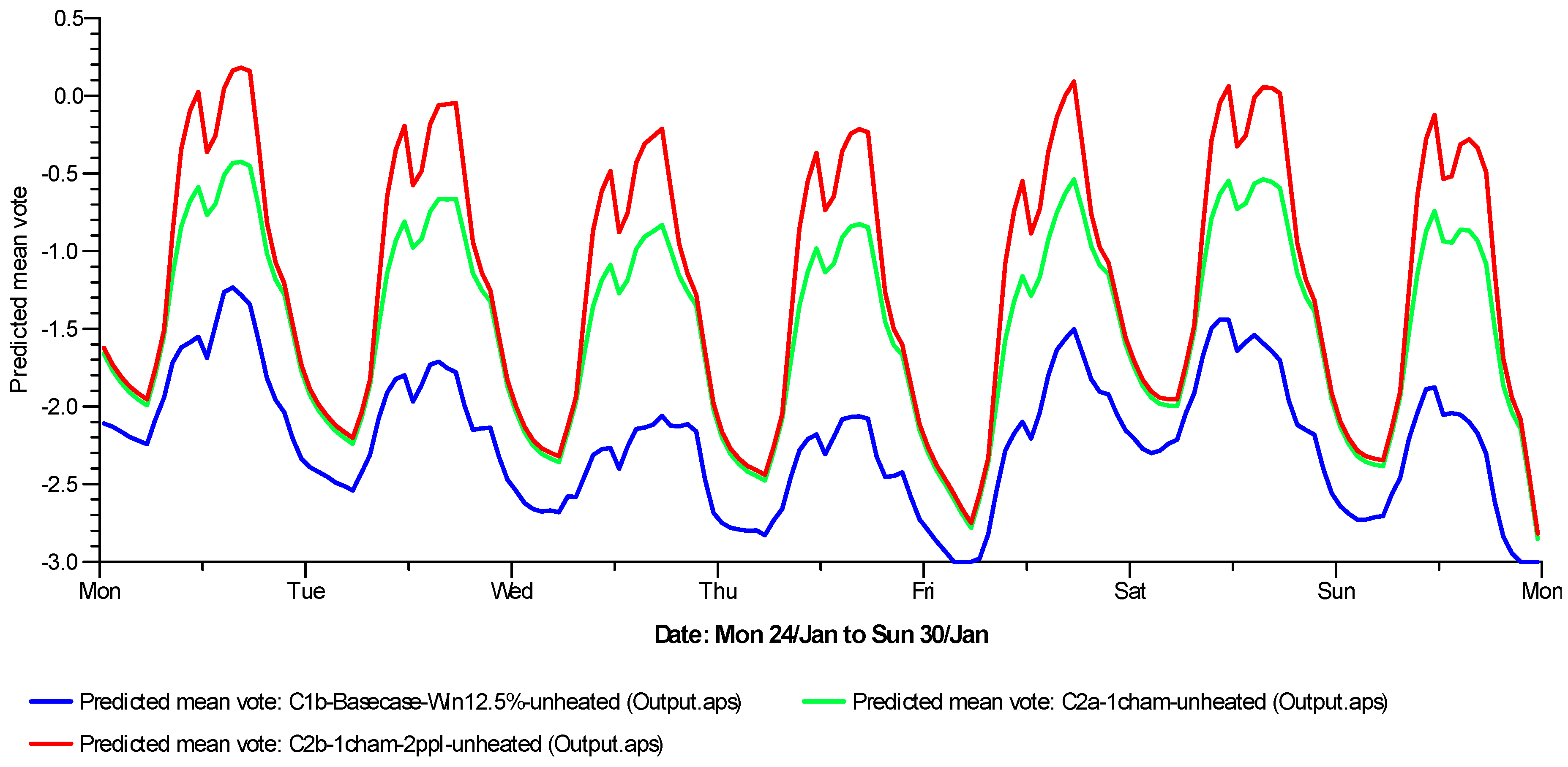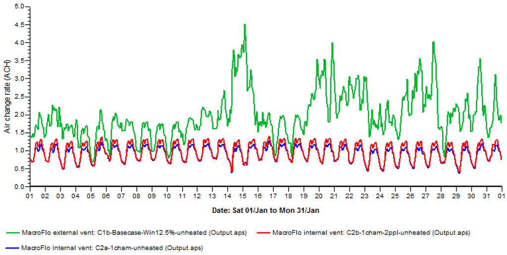 | Case 2b: 1 chamber, 2 people, unheated | 0.41 (4.72) | 05:30, 29 Jan | 1.41 (16.37) | 17:30, 16 Jan | 0.99 (11.55) |