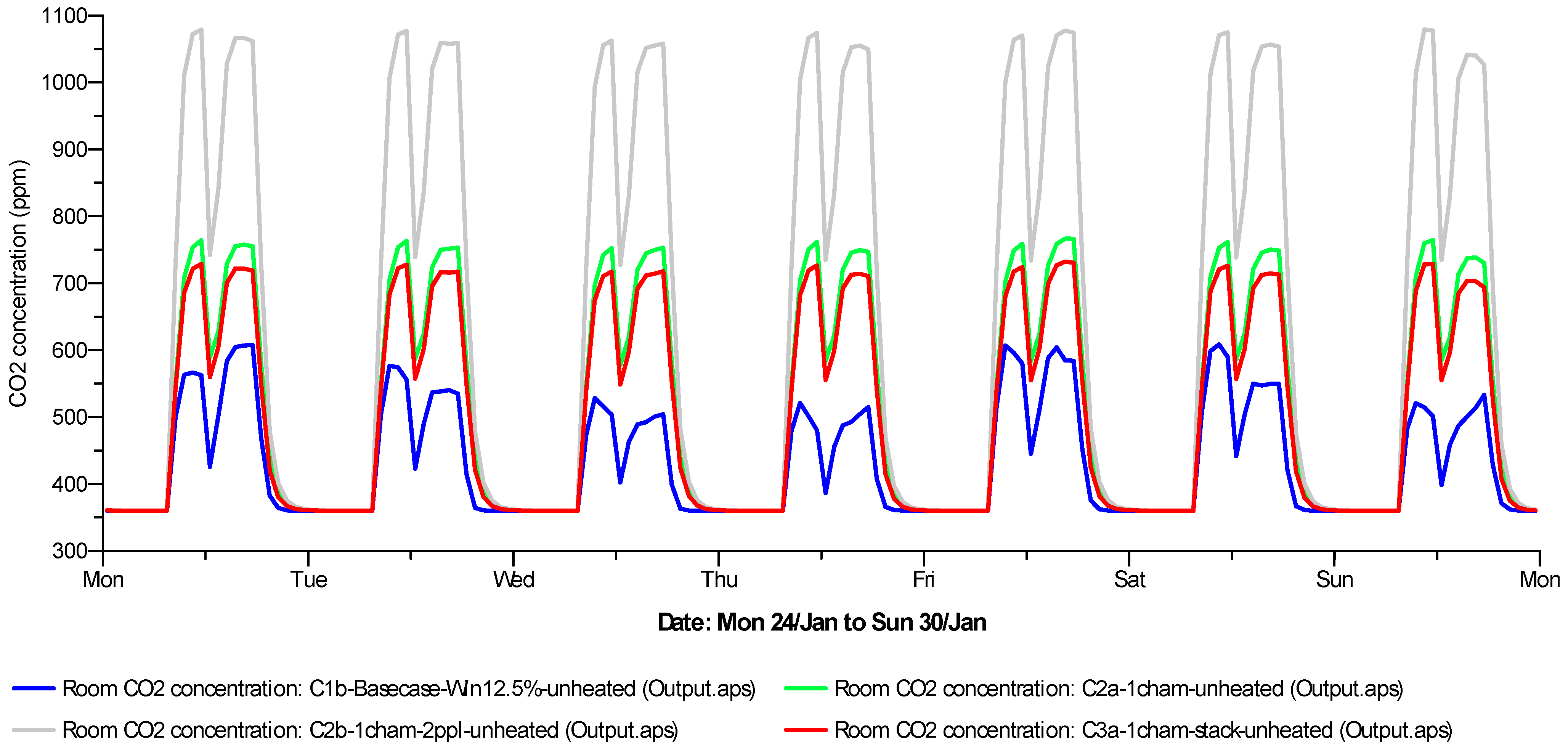 For the NVHR cases, the daily indoor CO2 concentration with double occupancy exceeds 1000 ppm but with a single occupant the concentration remains below 800 ppm (Figure 13). When the LoH Chamber’s exhaust point is extended by a stack (Case 3a), the expected increase in airflow rates ensure that daily indoor CO2 concentration fall to around 700 ppm.