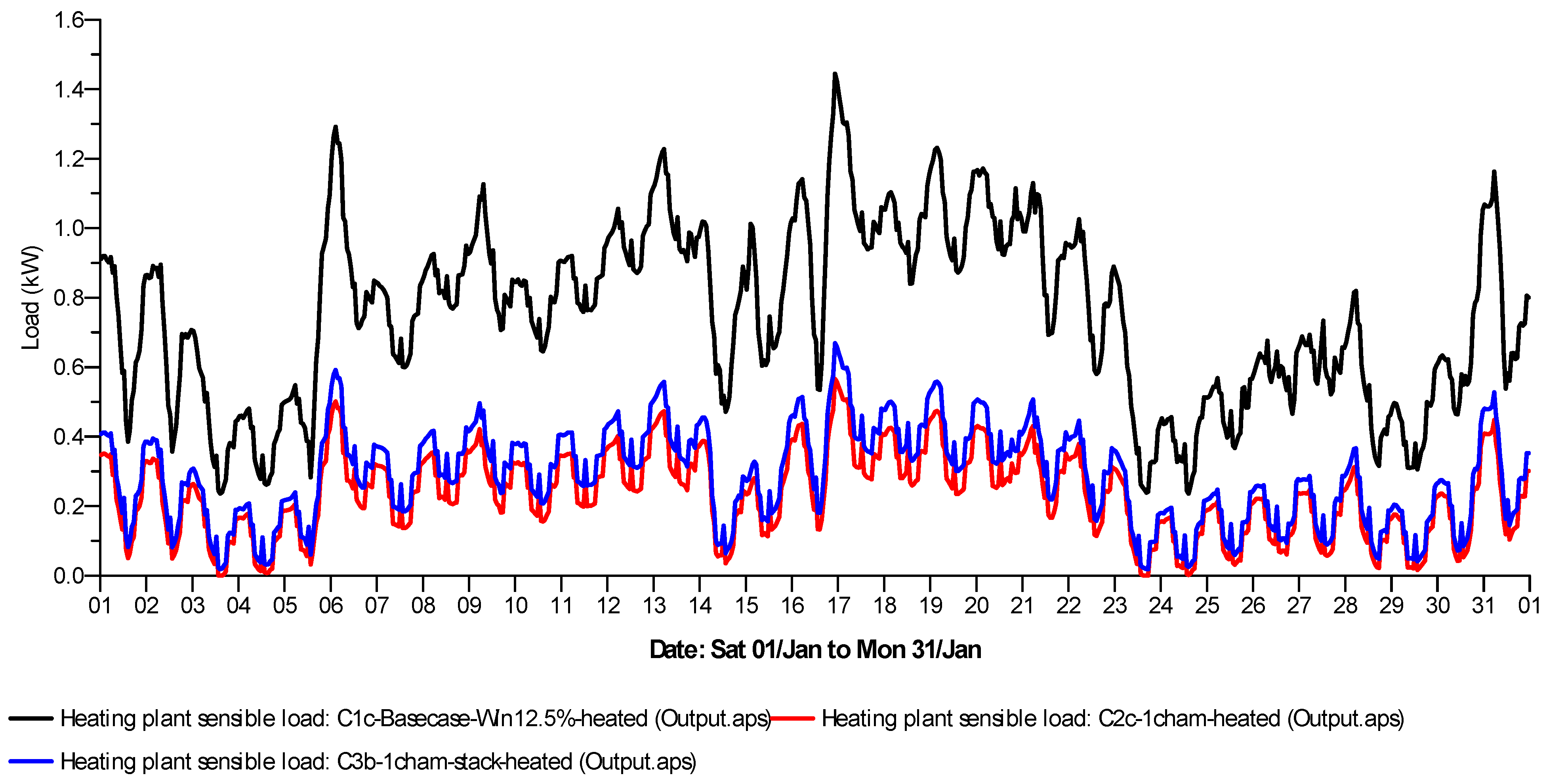 There are significant differences in power required to heat the spaces (Figure 14). Three cases where active heating was used are compared: Case 1c (window at 12.5% opening fraction); Case 2c (NVHR with one occupant) and Case 3b (stacked NVHR with one occupant). For all cases, heating power would peak on 16 January with up to 1.445 kW for Case 1c and a maximum of 0.566 kW for the NVHR Case 2c.