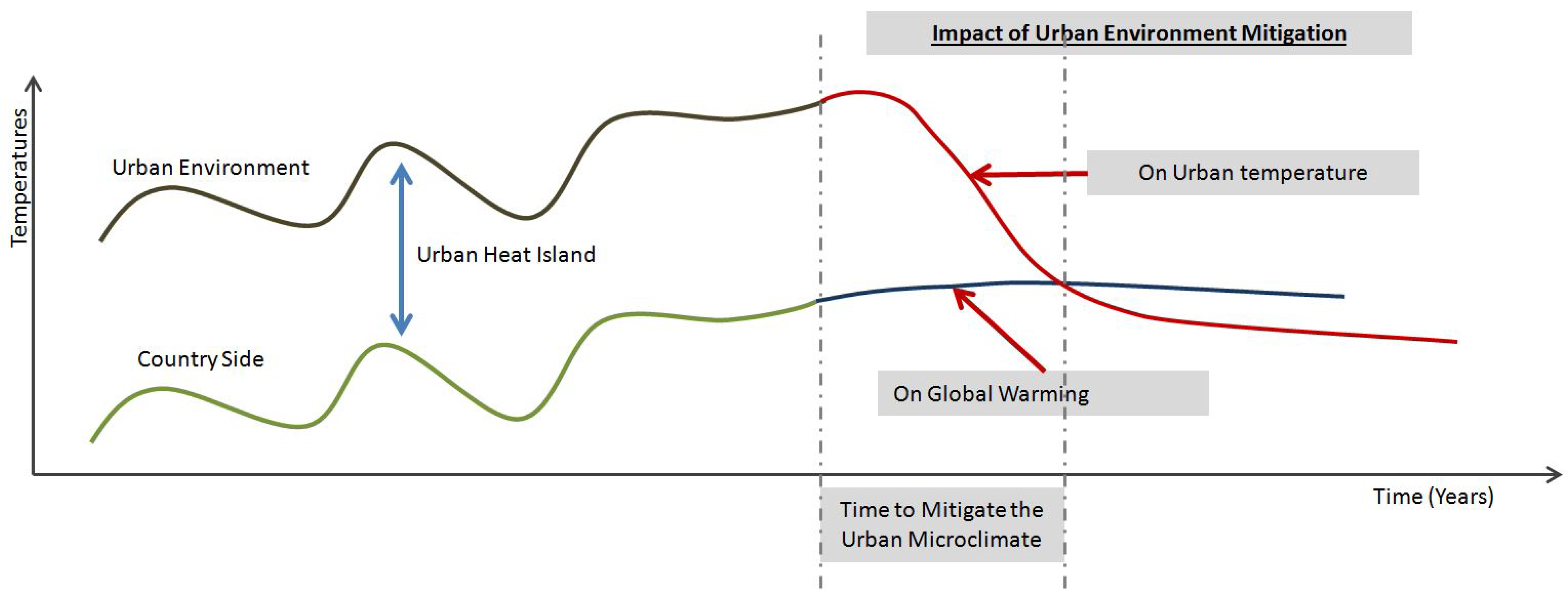 It is necessary to find international agreement on the urban microclimate and environment as a social good [43] and to integrate this concept within the discussion on public spaces and on their quality as a base for urban prosperity as defined by the UN [43,44]. The challenge is to provide cities in developed countries with the opportunity to meet the GHG reduction targets and cities in emerging and developing countries the ground to leapfrog from an energy-based model to a more sustainable and more feasible model of growth. The innovation of the proposed concept is that urban environments can be designed and managed in such a way that their microclimate becomes favorable for outdoor activities and reduces the energy demand of buildings. The microclimate of cities can be mitigated and it could be aligned with the surrounding regional climate (Figure 5). Many studies report on the positive impacts that mitigative strategies (i.e., cool roofs, vegetation, water bodies, cool pavement) have on the urban temperature, but unfortunately there are no cumulative applications of the same at a greater urban scale yet. However, there are some applications at the scale of an urban block that have tried to apply a number of strategies, and, despite the small dimension, have shown a great impact, with a peak summer temperature reduction of up to 3.5 K [49].