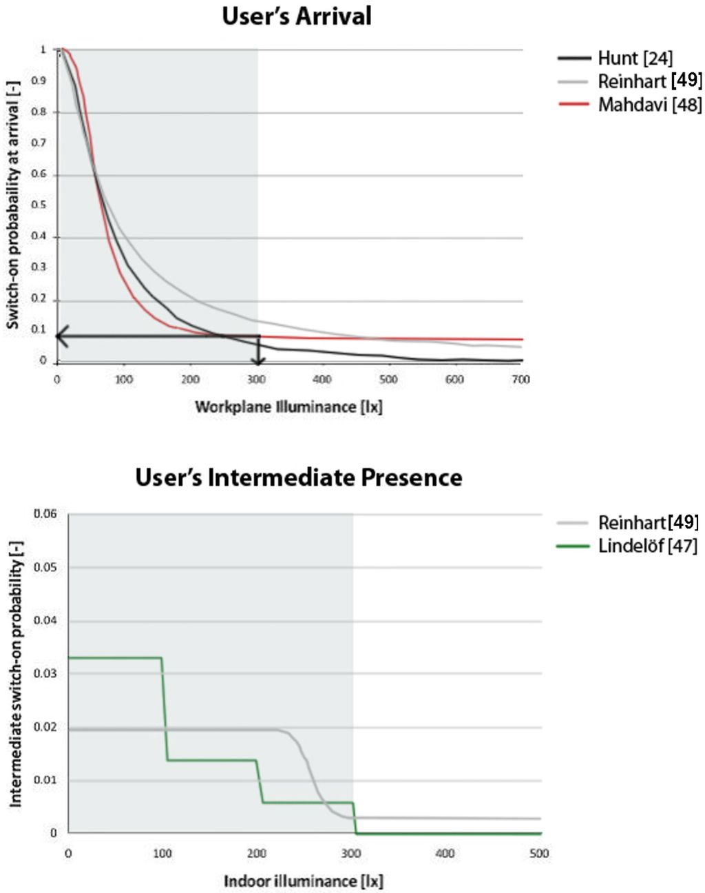 Comparison of probability functions of switching the lights on at users’ arrival and intermediate presence, adapted from [49].