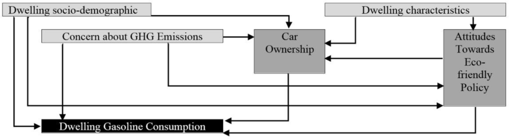 As shown in Table 2, many drivers are estimated to affect domestic gasoline consumption, such as built environment, the tenure of a private vehicle, the resident’s socio-demographics, and the individual’s attitudes. The built environment could affect domestic energy consumption both directly and indirectly through the tenure of private vehicles while the consumption may be also affected by both socio-demographics and attitudes.
