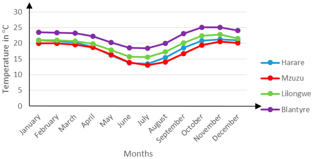 A comparison of mean monthly temperatures for Harare City in Zimbabwe and the three Malawian Cities of Mzuzu, Lilongwe and Blantyre shows of the similarity in these countries’ climatic conditions as presented in Figure 4 below.
