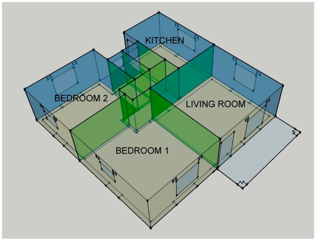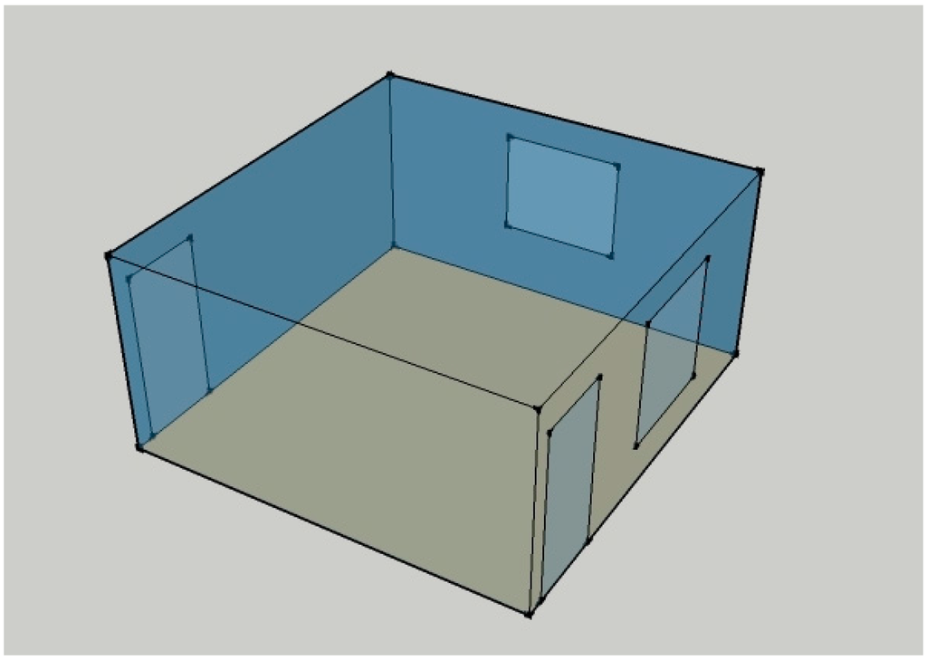 For purposes of ensuring ease of management of the simulation environment and enhancing accuracy of results, this study zeroed in on a singly zoned model. This model had one thermal zone, the living room, which was extracted from the full model of the typical residential building. The singly zoned model is shown in Figure 6 below:
