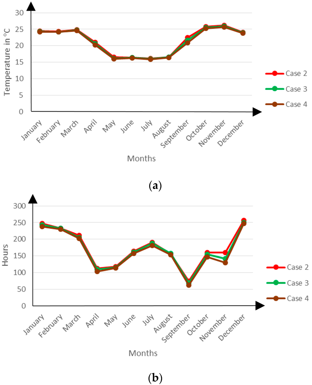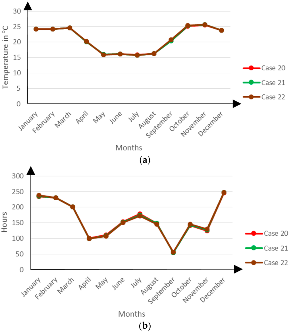 Monthly mean zonal temperatures (a) and discomfort hours (b) for Cases 20, 21 and 22.