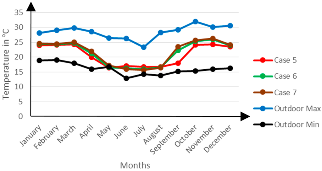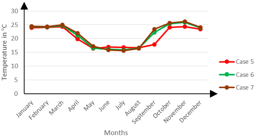 Case 5 has the largest air bricks’ surface area and thus the largest air infiltration volumetric flow rate at 0.2408 m3·s−1. The bigger infiltration rate means that during the winter period, Case 5 continues to draw huge volumes of cold air into the indoor environment much to the discomfort of the occupants. However, this volumetric flow rate is seen to be helpful in summer for purposes of enhancing the comfort levels.