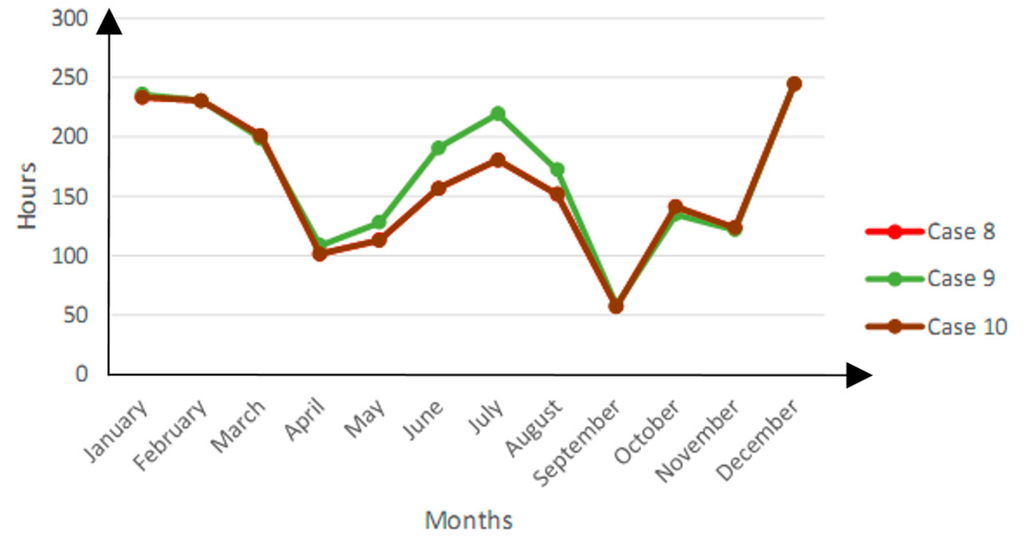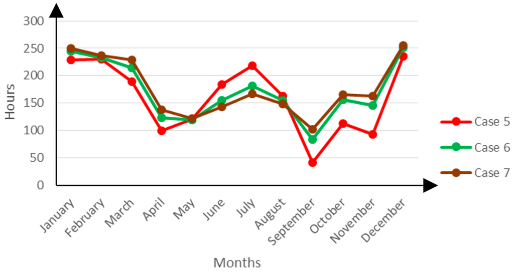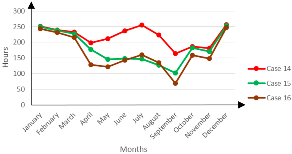 The winter entrapment of indoor heat seems to be so severe that the indoor temperatures rise to uncomfortable levels while the summer limitation of the outdoor heat from reaching the indoor environment helps to moderate the discomfort hours in Case 17. The Figure 18 below shows the variation of the discomfort hours across the year.