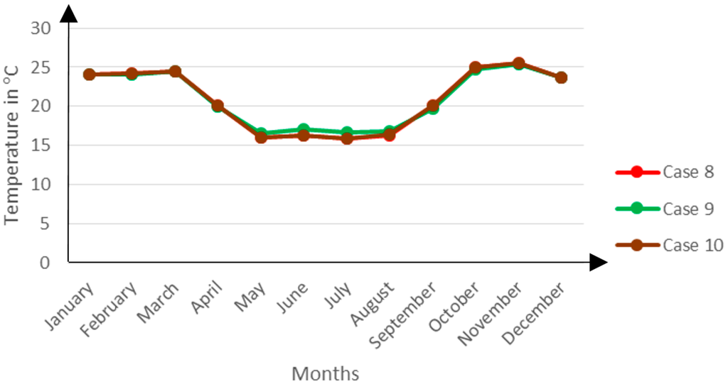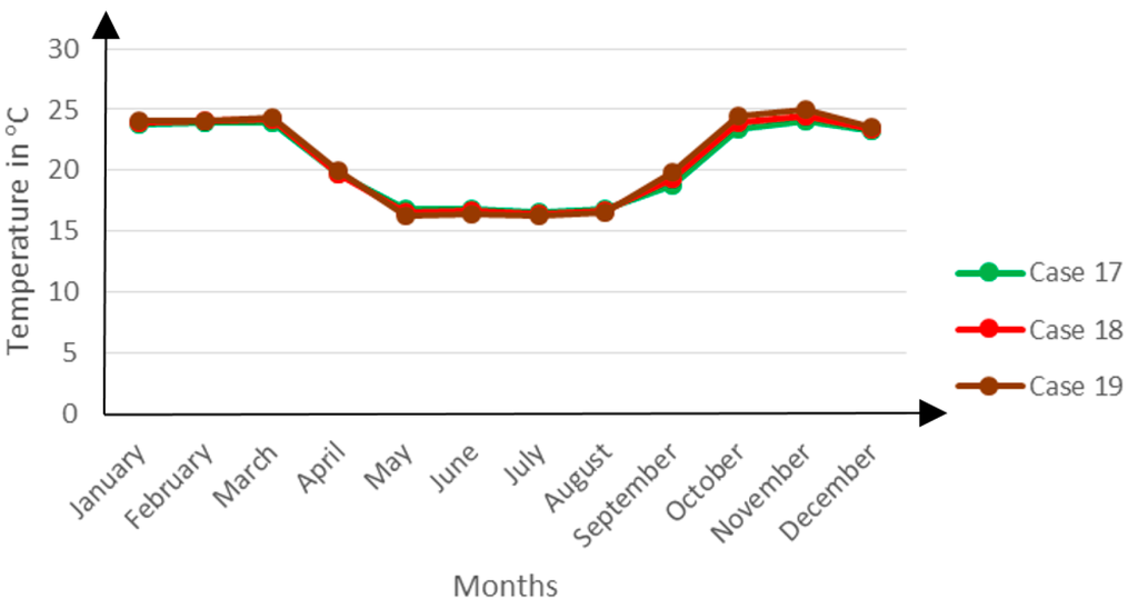Between the winter months of May and August, Case 17 registers slightly higher temperatures than Cases 17 and 18. This can be attributed to two factors namely the limited ventilation flow rate when the windows are opened and the limited heat flux density through the glazing when the windows are closed.