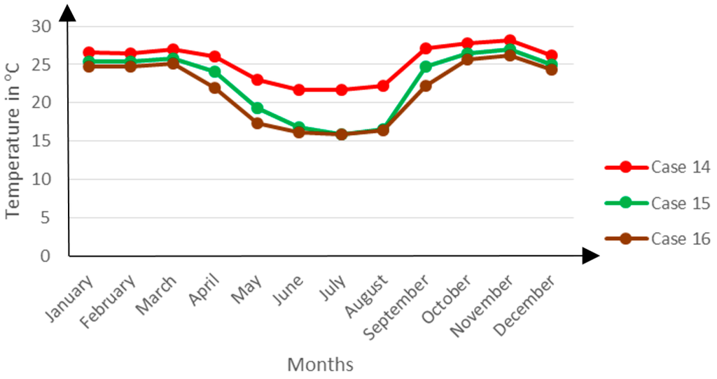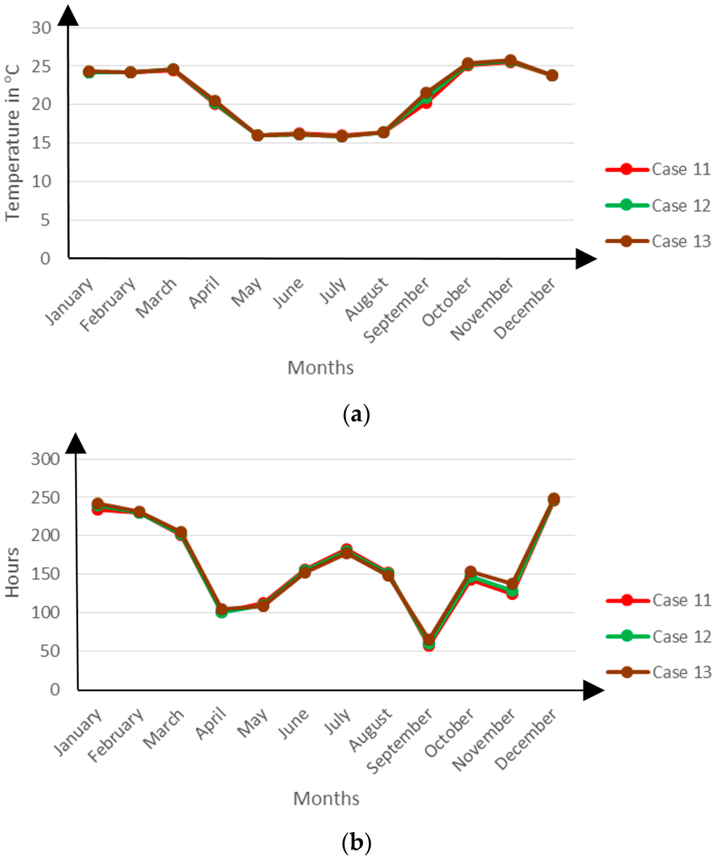 The results confirm the ANOVA results that this parameter’s contribution to the thermal performance is very small. There is hardly any marked variation in the zonal temperatures and discomfort hours registered by these Cases as shown in Figure 19 below: