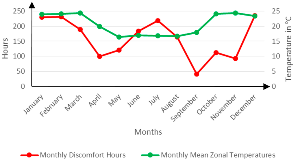 As the outdoor temperatures begin to fall around March, the indoor environment begins to register similar falls with reciprocal drops in discomfort hours which only last until April before beginning to rise again around May, peaking in July at the height of winter.