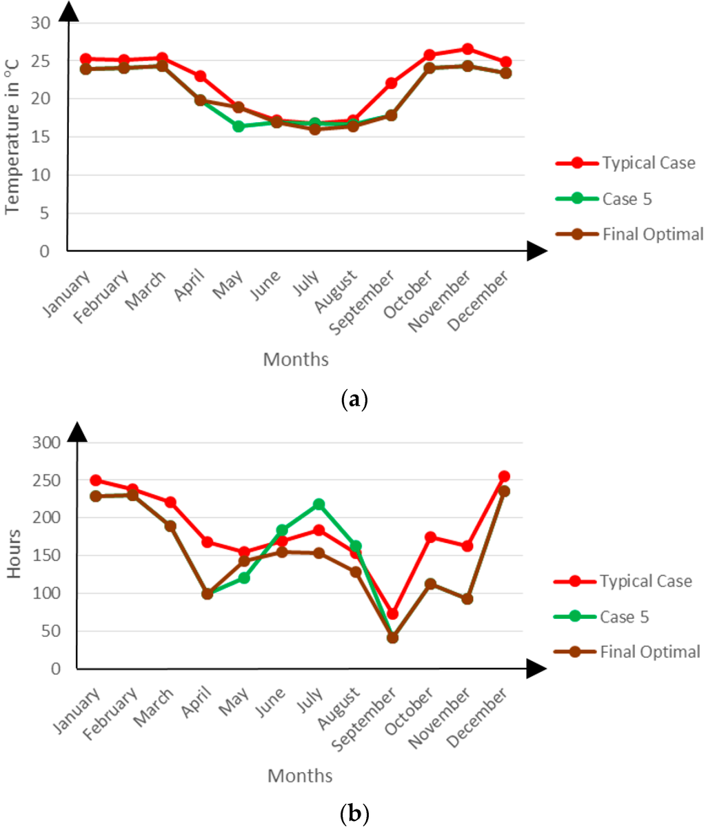 Monthly mean zonal temperatures (a), discomfort hours (b) for typical case, Case 5 and final optimal case.