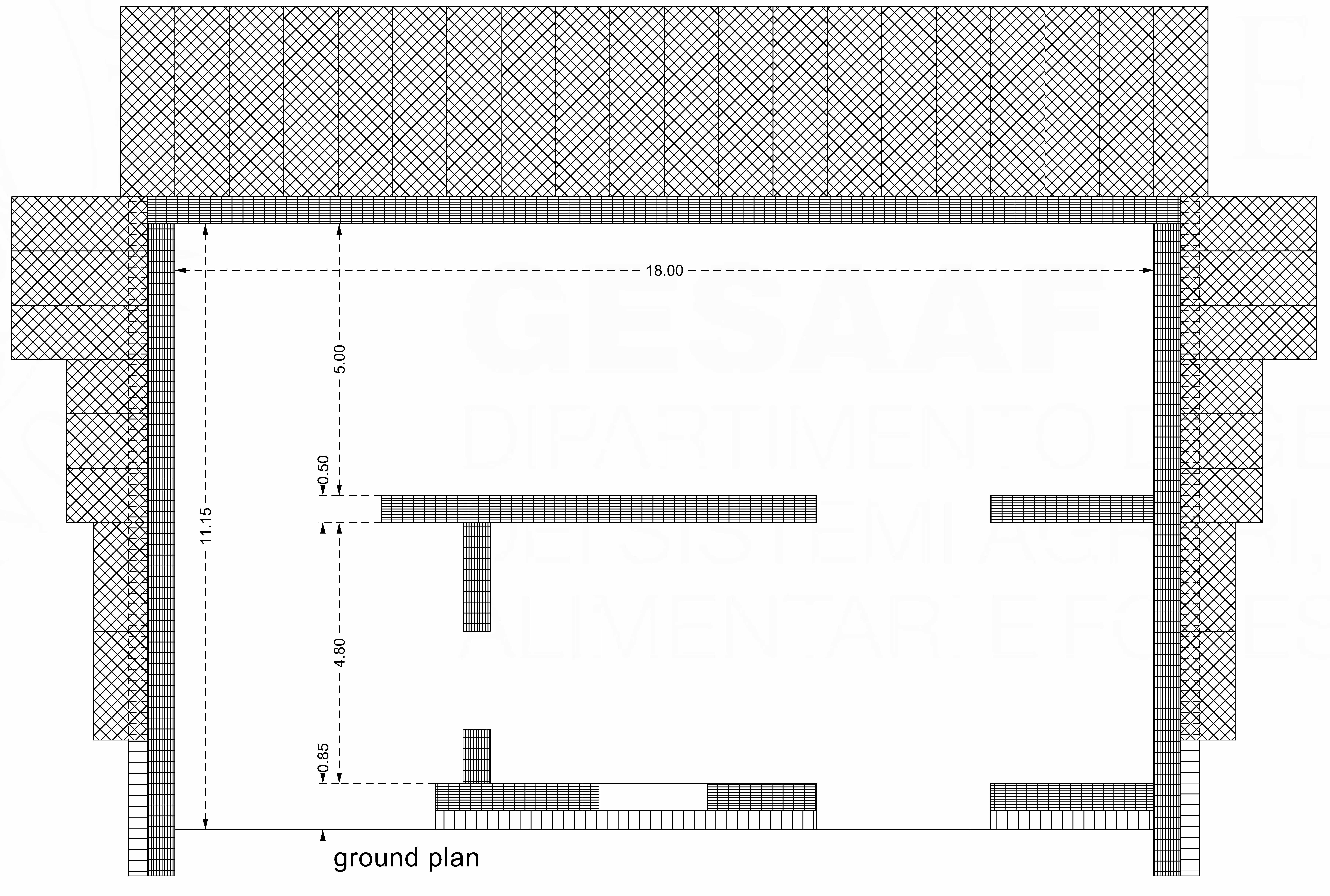 The project involves the design of a multi-purpose agricultural basement building with the dimensions 18 m × 10 m, which will be divided internally into three distinct functional areas: an area devoted to a wine cellar (18 m × 5 m), a laboratory for the finishing of farm products (12.20 m × 4.80 m) and a tasting area (5.30 m × 5.50 m). The bearing walls and foundations are entirely built with a wire mesh gabion system and loose stones (Figure 1 and Figure 2).