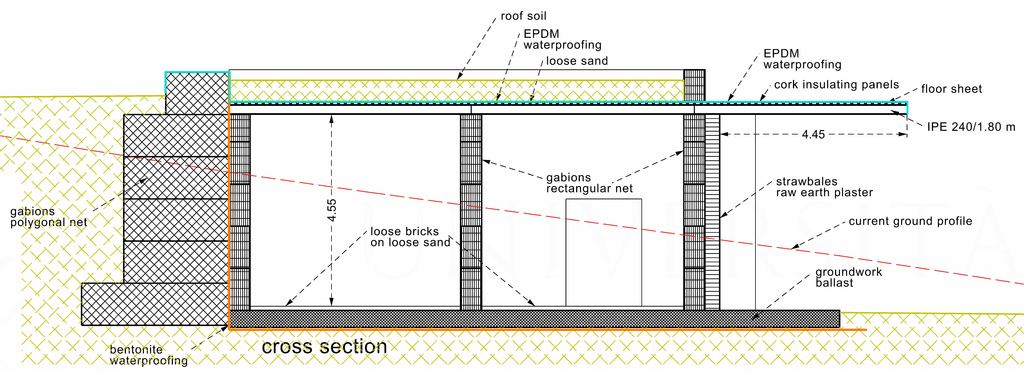 In order to waterproof the building, bentonite clay sheets are placed both between the ground-retaining gabions and the bearing walls, and between the foundation ballast and the ground.