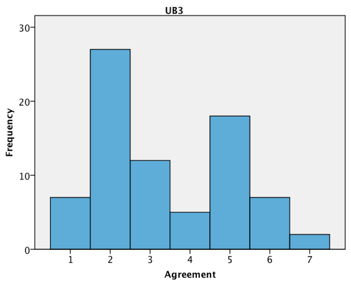 Figure 1, Figure 2 and Figure 3 show the distribution of agreement to UB1, UB2, and UB3. Figure 1 and Figure 2 show that a high proportion of users carry their phones and stay in the same room when they are at home. The agreement to UB3 did not show a significant modality, which indicates there may be individual differences in the occurrence of comfort disputes.