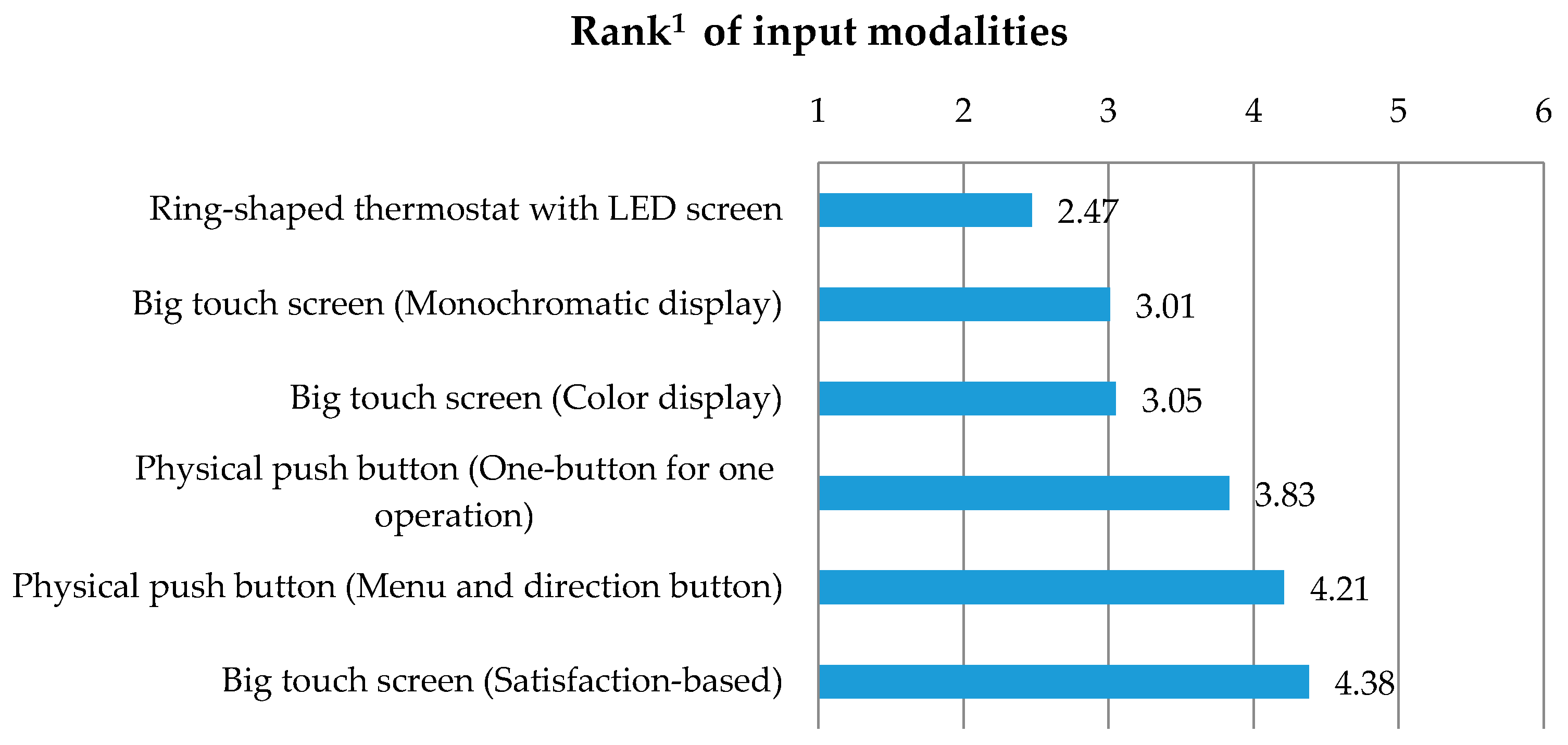Figure 9 ranks the preference for six typical input modalities in the survey (note that lower rank means higher preference). The ring-shaped thermostat with an LED screen ranked first, followed by the monochromatic touch screen and color touch screen. The satisfaction-based touch screen came in last, partially because it was just a prototype.