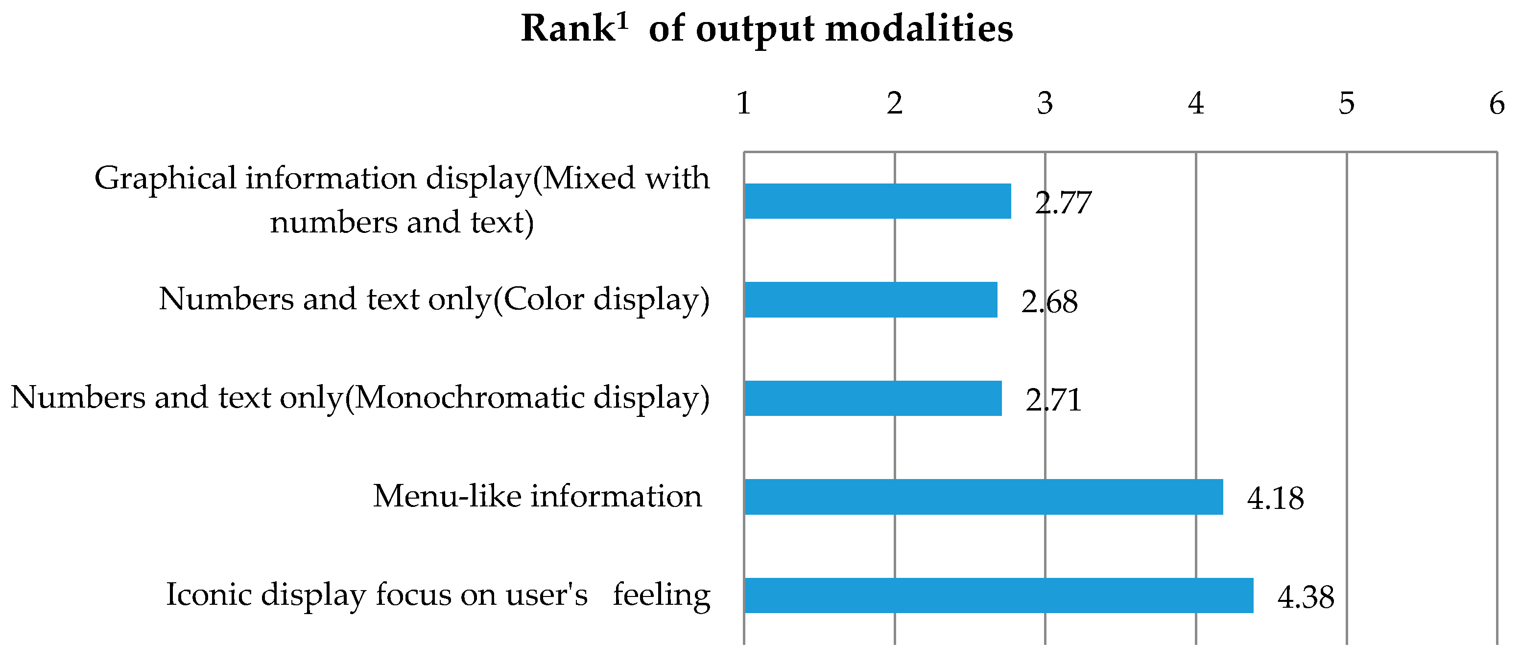 For the output modalities, Figure 10 calculates the mean rank for five typical output modalities (note that lower rank means higher preference). Graphical information display (mixed numbers and text) took first place, while output modalities based on numbers and text followed. Iconic display focusing on user’s feeling came in last.