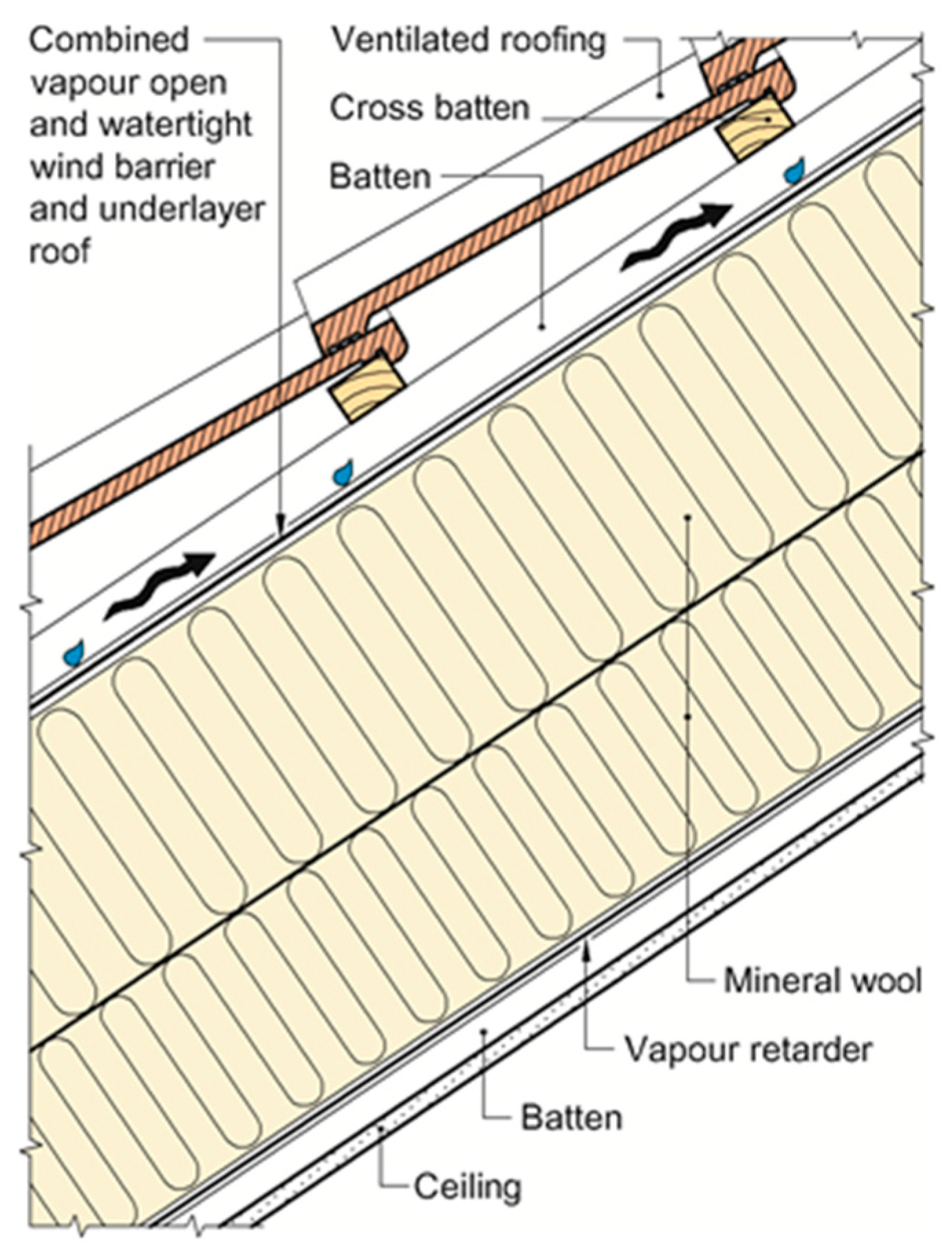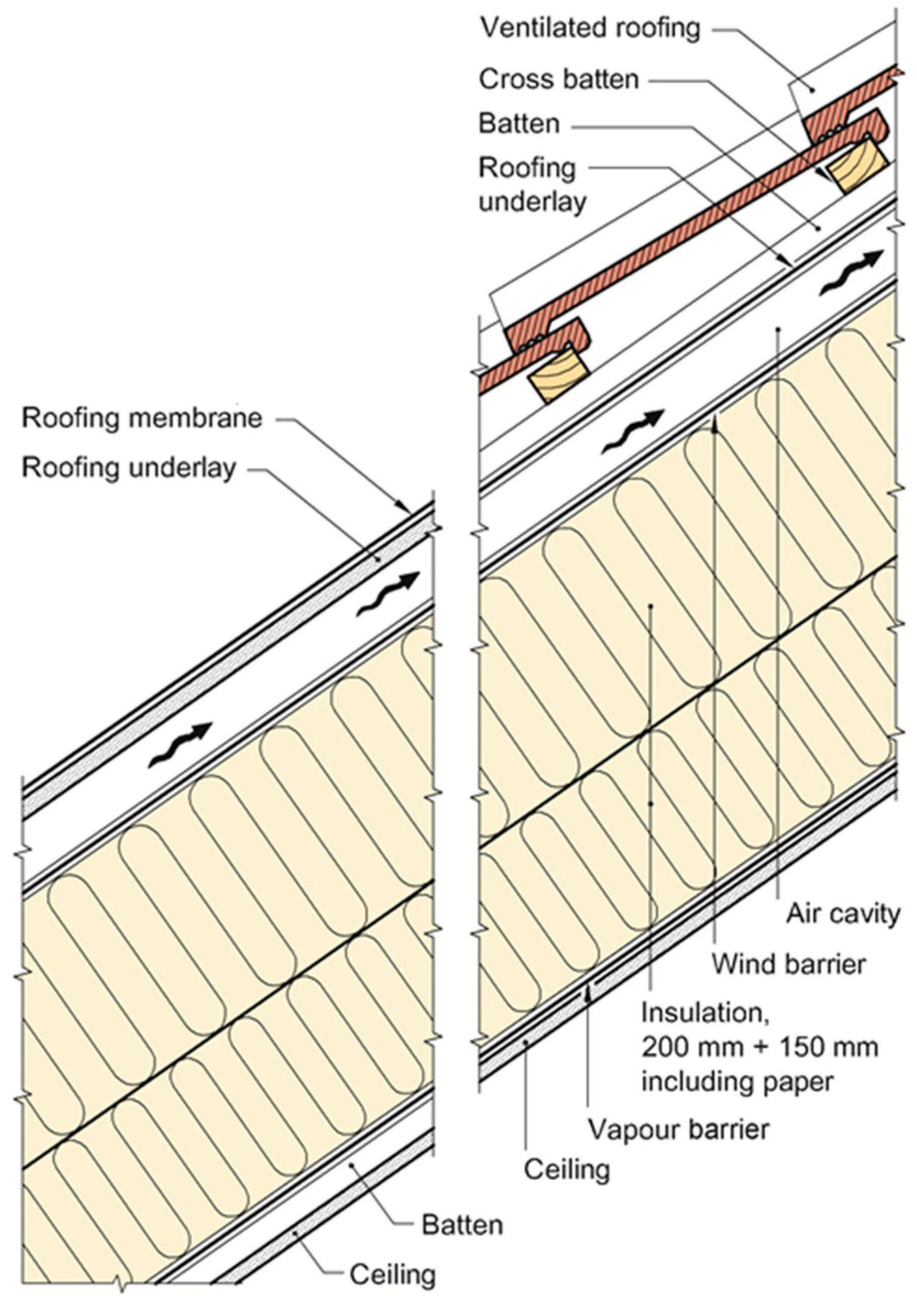 - Pitched wooden roofs with separate wind barrier and underlayer roof (ventilation air cavity between wind barrier and underlayer roof).