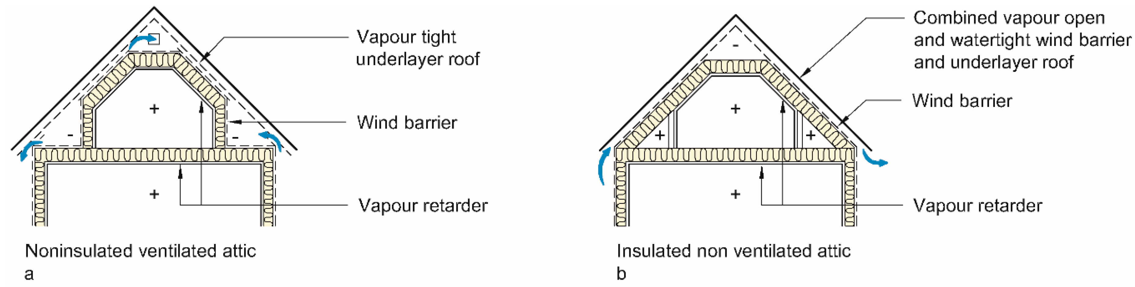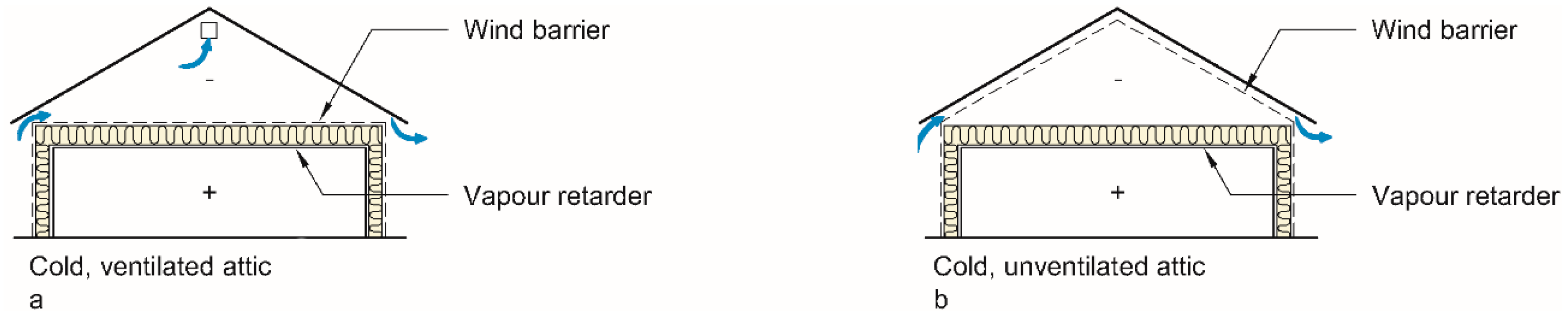- Cold, unventilated attic space with all ventilation between the underlayer roof and roof covering. The construction is a further development of a) and an improved roof design. The underlayer roof is a vapour open and watertight wind barrier. Both the wind barrier and vapour retarder should be used continuously, thus making it easier to ensure airtightness of the building.