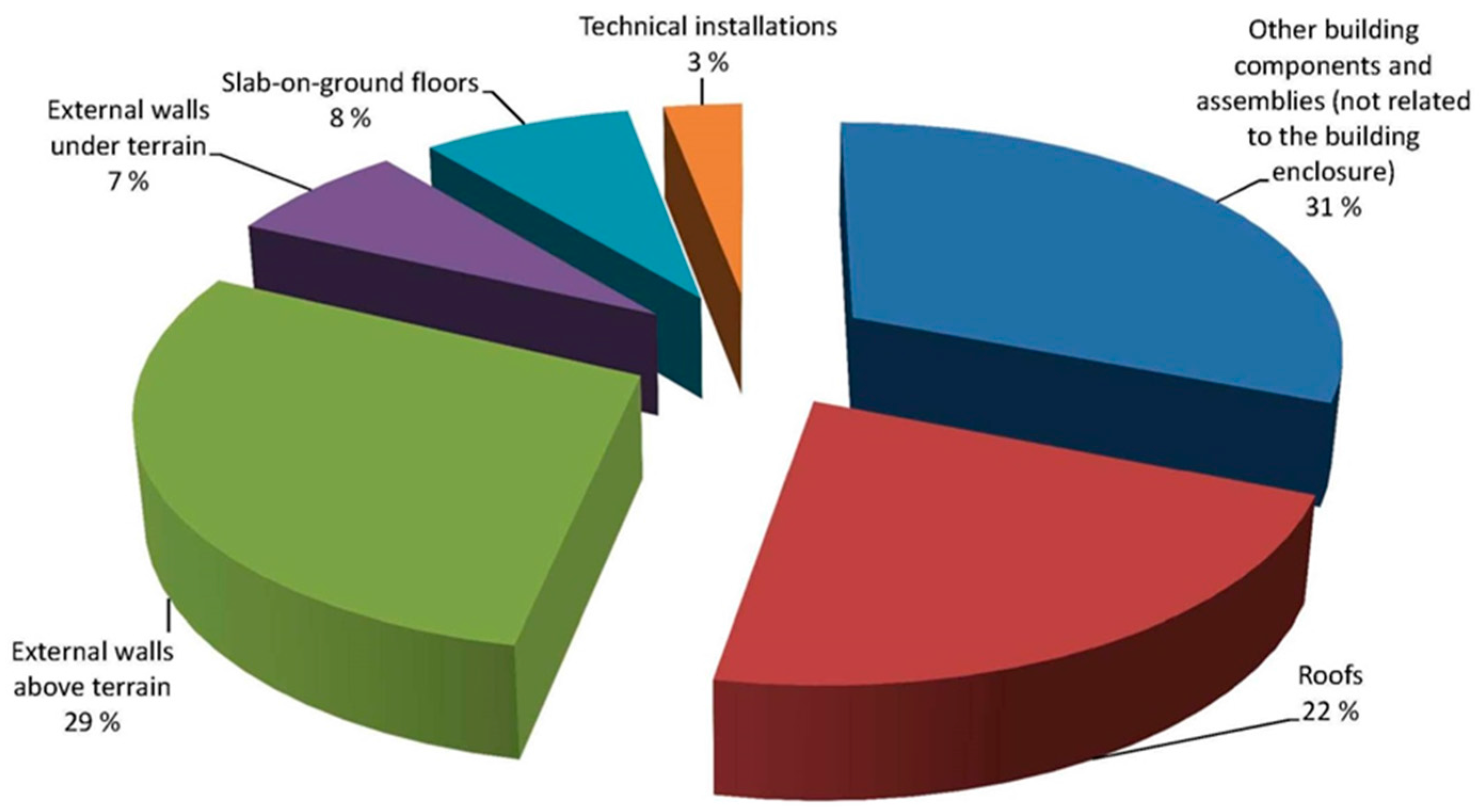 As Figure 5 shows, 22% of the registered building defects are localized in roofs. Furthermore, 24% of the total building defects are caused by precipitation (see Table 1). It is worth noting that 75% of all defects are caused by moisture alone or as a consequence of moisture.