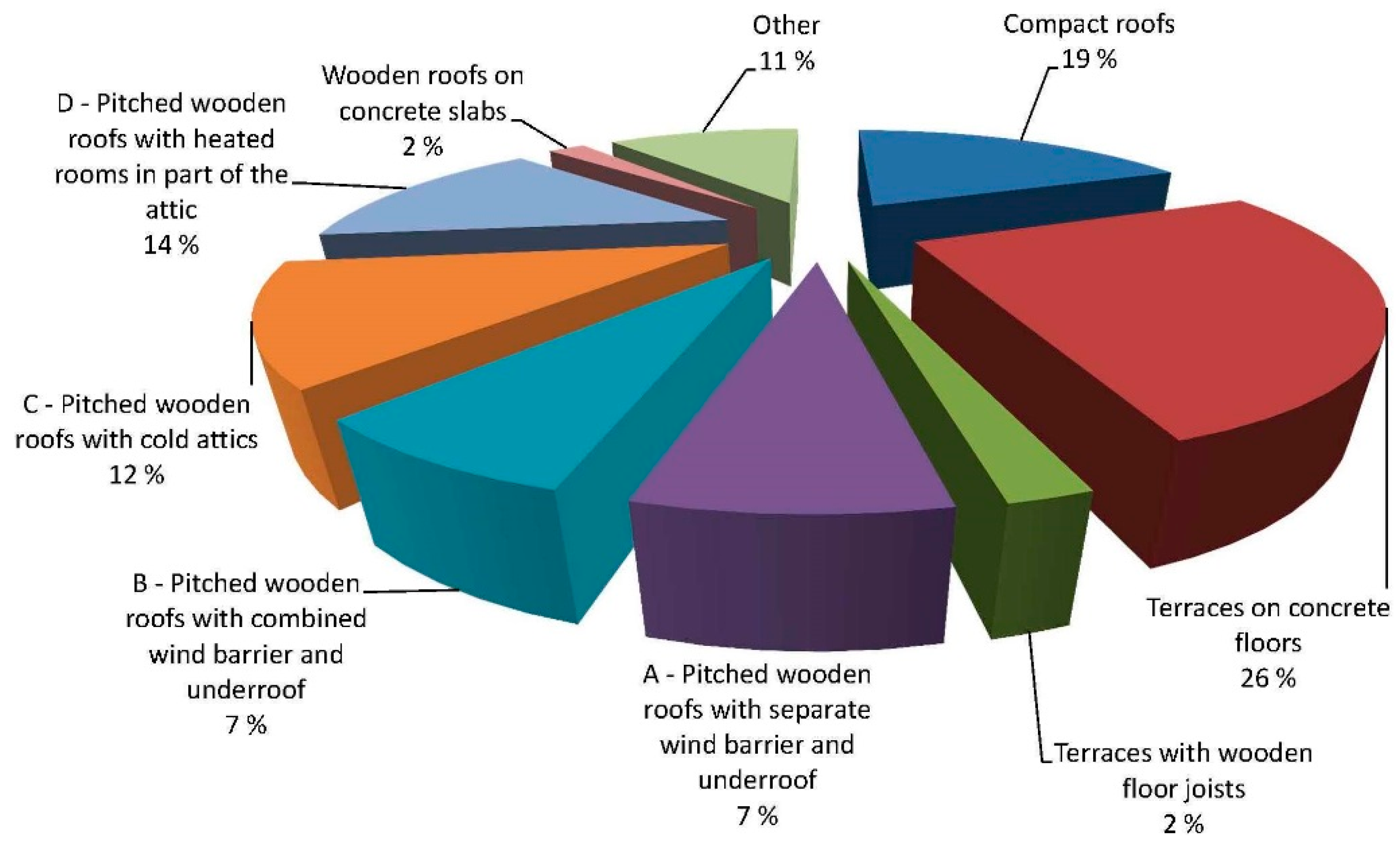 SINTEF's building defect archive classifies pitched roof constructions into the following four types: (A) pitched wooden roofs with separate wind barrier and underlayer roof (venting air cavity between wind barrier and underlayer roof), (B) pitched wooden roofs with combined underlayer roof and wind barrier, also known as watertight vapour open membrane, (C) pitched wooden roofs with cold attics, and (D) pitched wooden roofs with heated rooms in parts of the attic. “Wooden roof” is defined by the wood based load-bearing system of the roof according to [13]. Defects on roof construction types A, B, C, and D are compared with defects on compact roofs and terraces.
