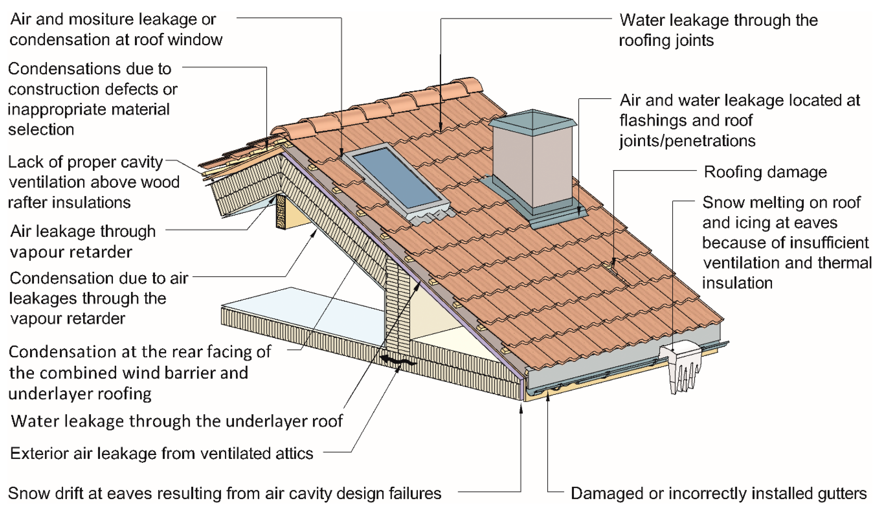 Typical damage and mistakes in thermally insulated pitched wooden roofs, according to findings from SINTEF’s building defect archive, are summarized in Figure 7.