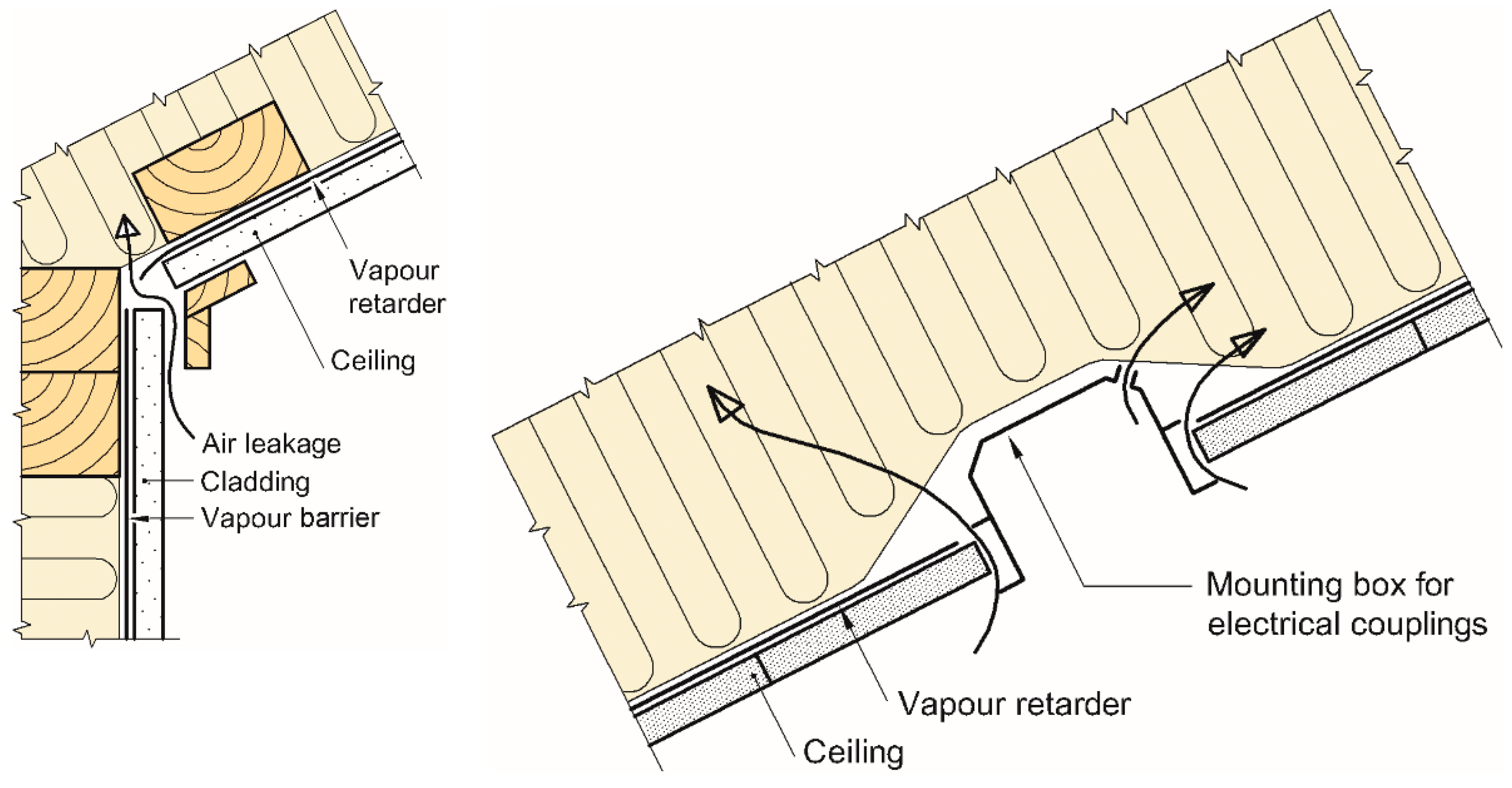 - Cold, ventilated attic space with air stream flowing through the attic itself. The underlayer roof may be vapour tight. There are ventilation openings in the ridge and between the underlayer roof and the thermal insulation along the eaves of the building. Ventilation openings have to be designed in order to avoid penetration of snow and rain into the attic. Only the vapour retarder contributes to the airtightness of the building (ceiling), making the solution vulnerable to holes and imperfections in the vapour retarder, which again can cause condensation because of air (containing moisture) leakages through the construction. Hagentoft et al. [15] found that the moisture level of cold ventilated lofts is improved if the attic floor is airtight, has low built-in moisture content, and has well-ventilated indoor air.