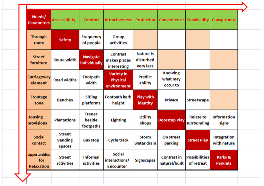 - Physical needs—The comfort experienced from external influences like climatic protection, traffic accidents, walking path modal conflicts.