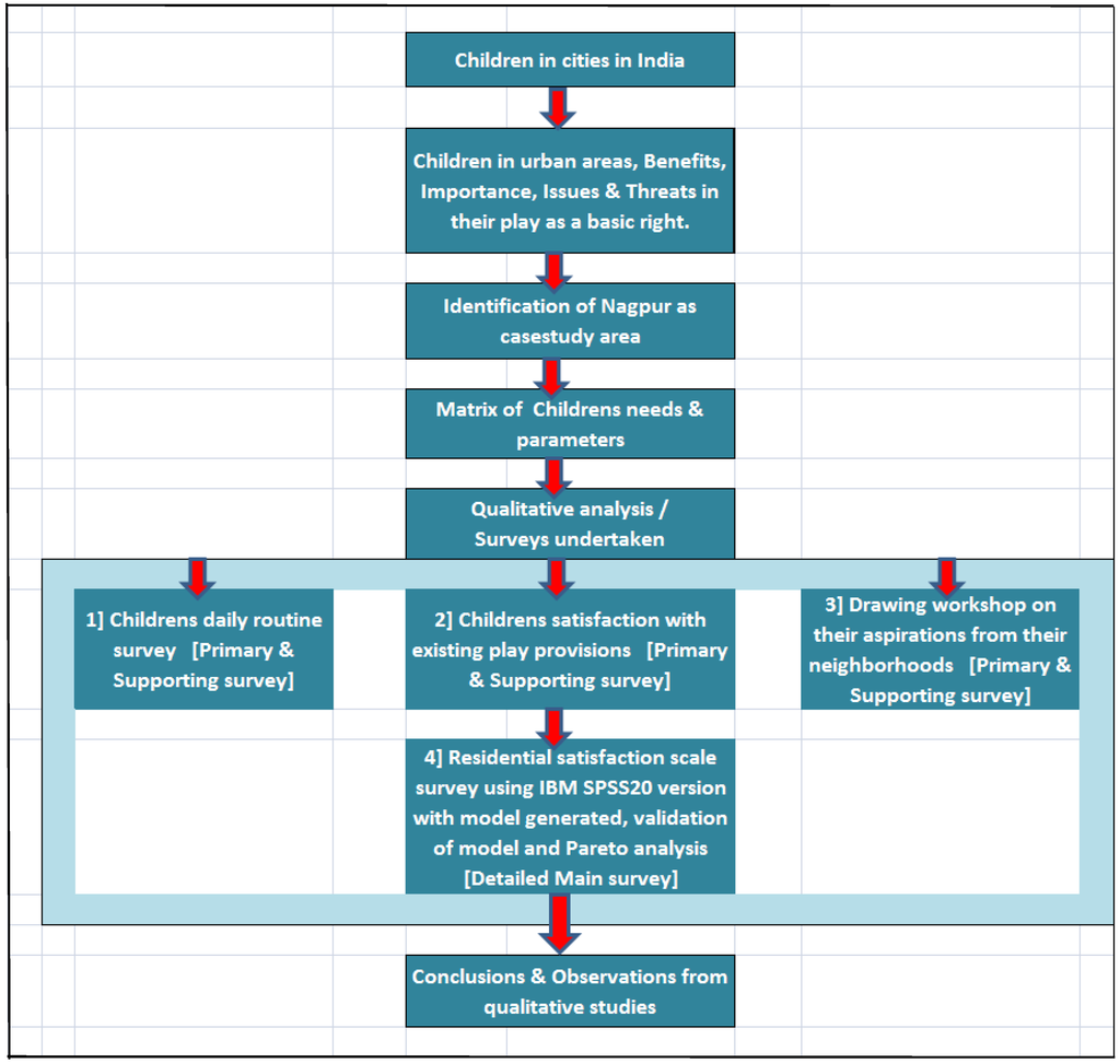 The methodology of the study as shown in Figure 2, begins with the literature data on children in cities in India with the various issues that they face as the blessing or a curse of growing up in urban India. The study majorly focuses on the issues with the childrens basic right to play. The paper brings forth the results of the three primary, supporting surveys relating to childrens daily routine, their opinion on the existing play provisions and then their aspirations from their neighborhoods in future, which sets up the preface to take up the main survey using SPSS to establish the relation between the residents satisfaction and analyzing it if it is being enhanced by the creation of ideal play provisions in the neighborhoods, with the creation of a model and establishing its relevance by validating it on other two neighborhoods as well.