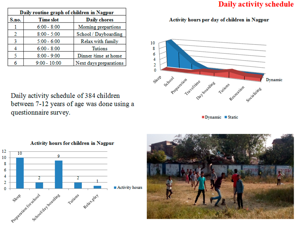 The survey revealed that, with the present planning and parents mindsets, the children have more time of their day spent in static activities like travelling to school by bus, school hours, tuition hours and sleep hours which amounts to almost 18–20 h of the day as compared to the dynamic activities for their overall development like recreation, play and socializing which is as low as 2–3 h a day as shown in the graph in Figure 3.
