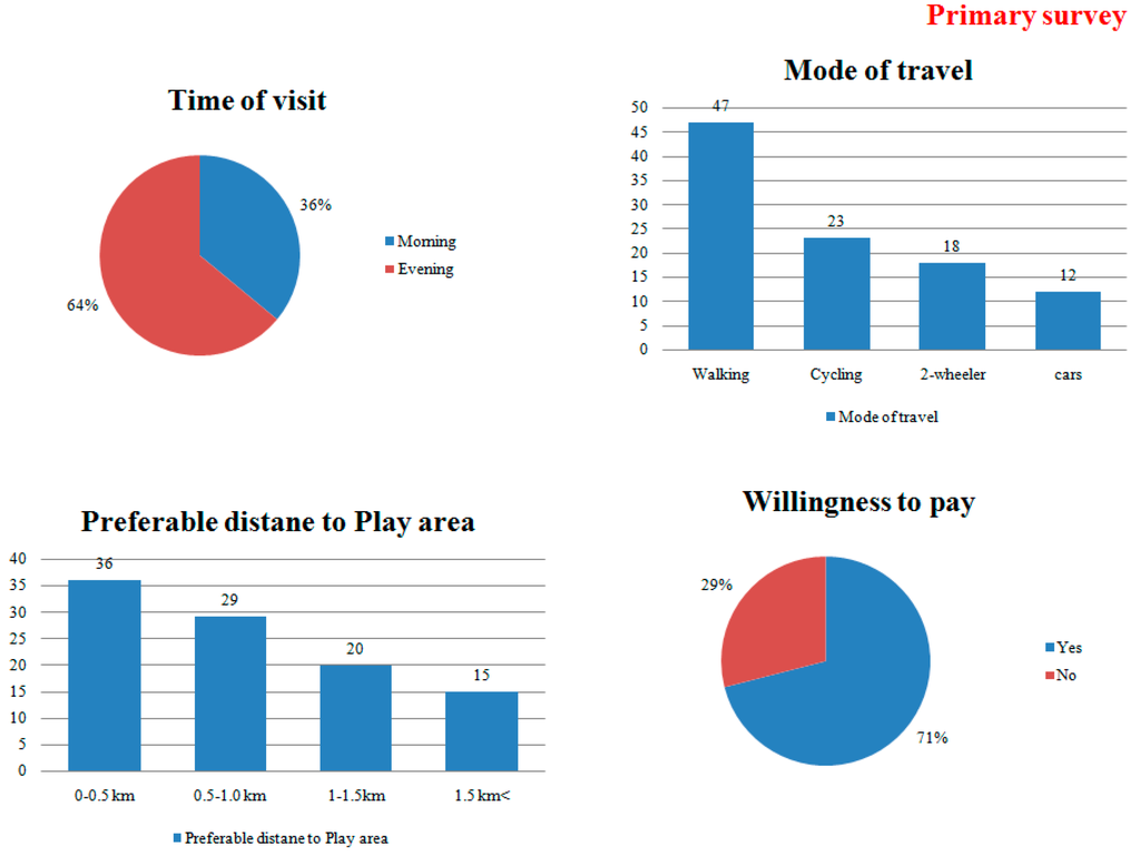 The questionnaire survey was conducted in which the results (as seen in the graphs in Figure 4 and Figure 5) showed that, most children (72%) prefer to go outdoors for play but the access to the parks is such that most of them have to be accompanied (59%) by their parents once a week to the nearby parks and playgrounds and on vehicles as they are not within the walkable distance from their place of residence. Children and their parents had the willingness to pay for the parks (71%) if they were well maintained with variety of play and within a walkable range of 500 m from their residences.
