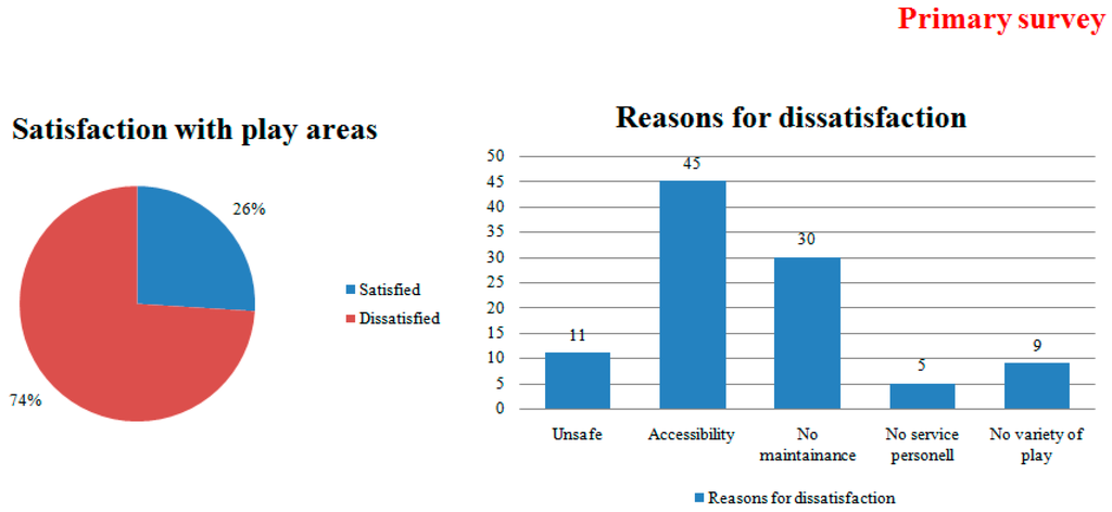The Figure 6 also shows graphs with only (26%) of children and parents reporting of being satisfied with the play provisions. The reasons of their dissatisfaction being accessibility, poor maintenance, lack of variety in play, etc.