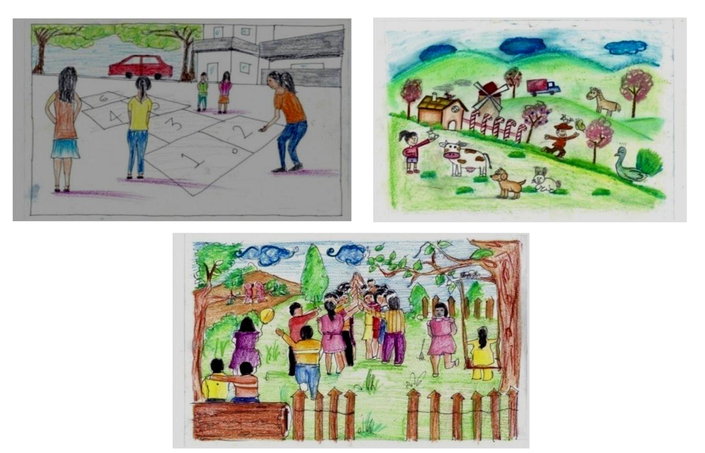 Drawings made by children, which shows the quality of the play provisions they aspire for in their neighborhoods, away from the traffic, with nature and animals and with a variety of play possibilities.