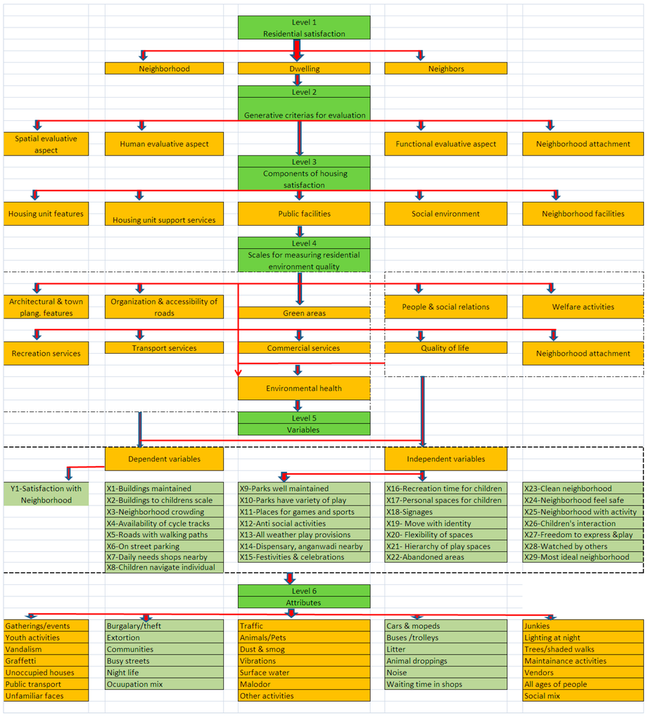 The theoritical model was tailored specifically for evaluation of neighborhoods in India which is dealt with in Figure 9 showing its growth from top to bottom giving all important details of the satisfaction scale.