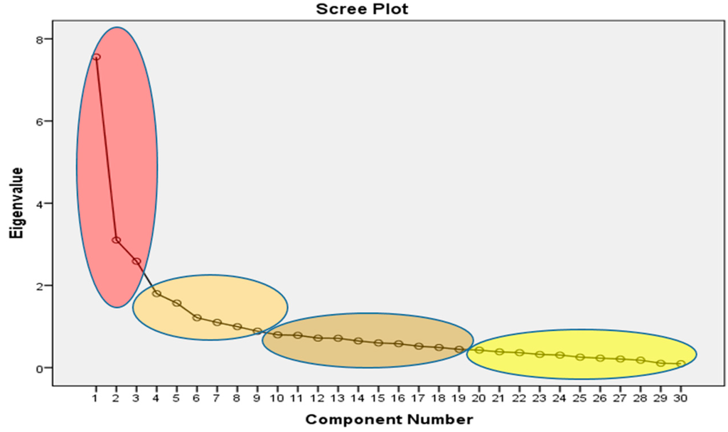 Figure 11. Scree plots of eigenvalues against factor numbers. - Component Matrix—This table contains the unrotated factor loadings, which are the correlations between the variable and the factor. Because these are correlations, possible values range from −1 to +1. The correlations that are 3 or less can be removed. This makes the output easier to read by removing the clutter of low correlations that are probably not meaningful anyway.