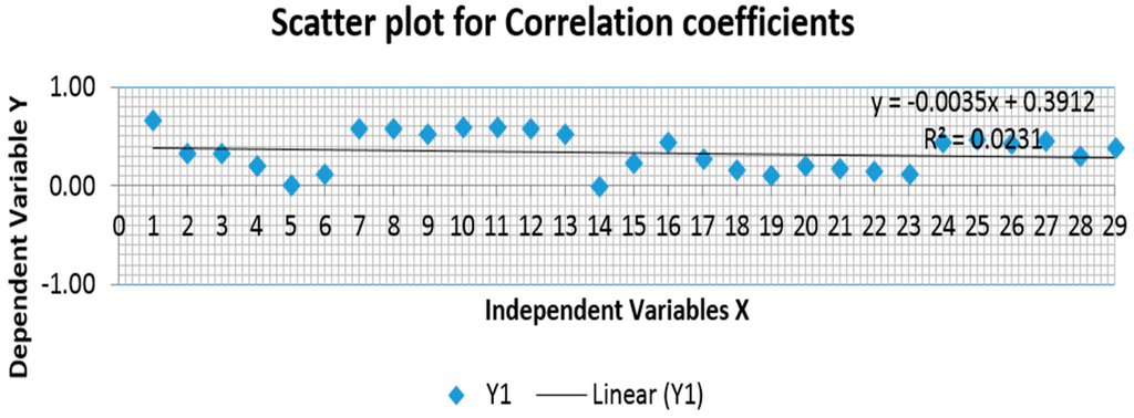 The scatter plot in Figure 12 shows the closeness of the variables to the dependent variable. A coefficient of −1 indicates a perfect negative correlation: A change in the value of one variable predicts a change in the opposite direction in the second variable as shown in the variable (X14). Lesser degrees of correlation are expressed as non-zero decimals. A coefficient of zero indicates there is no discernable relationship between fluctuations of the variables as in variable (X5).