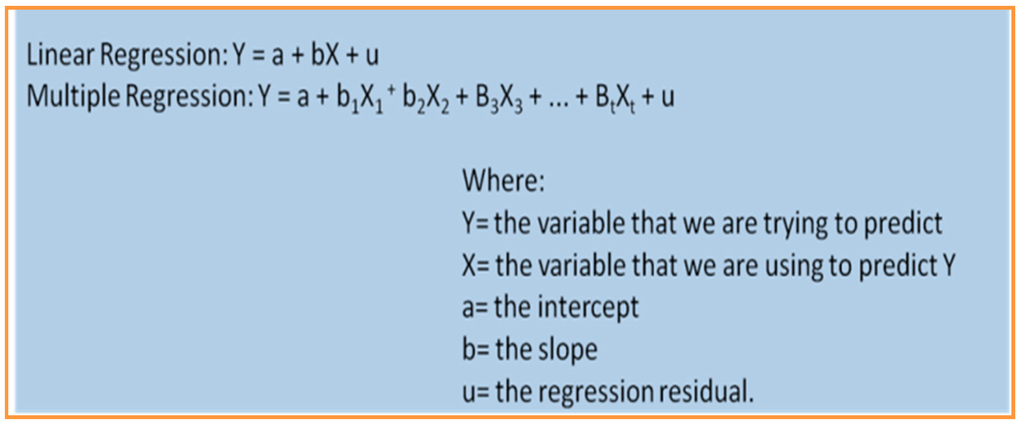 A statistical measure that attempts to determine the strength of the relationship between one dependent variable (usually denoted by Y) and a series of other changing variables (known as independent variables). The two basic types of regression are linear regression and multiple regressions. Linear regression uses one independent variable to explain and/or predict the outcome of Y, while multiple regressions use two or more independent variables to predict the outcome. The general form of each type of regression is as shown in Figure 13 below.