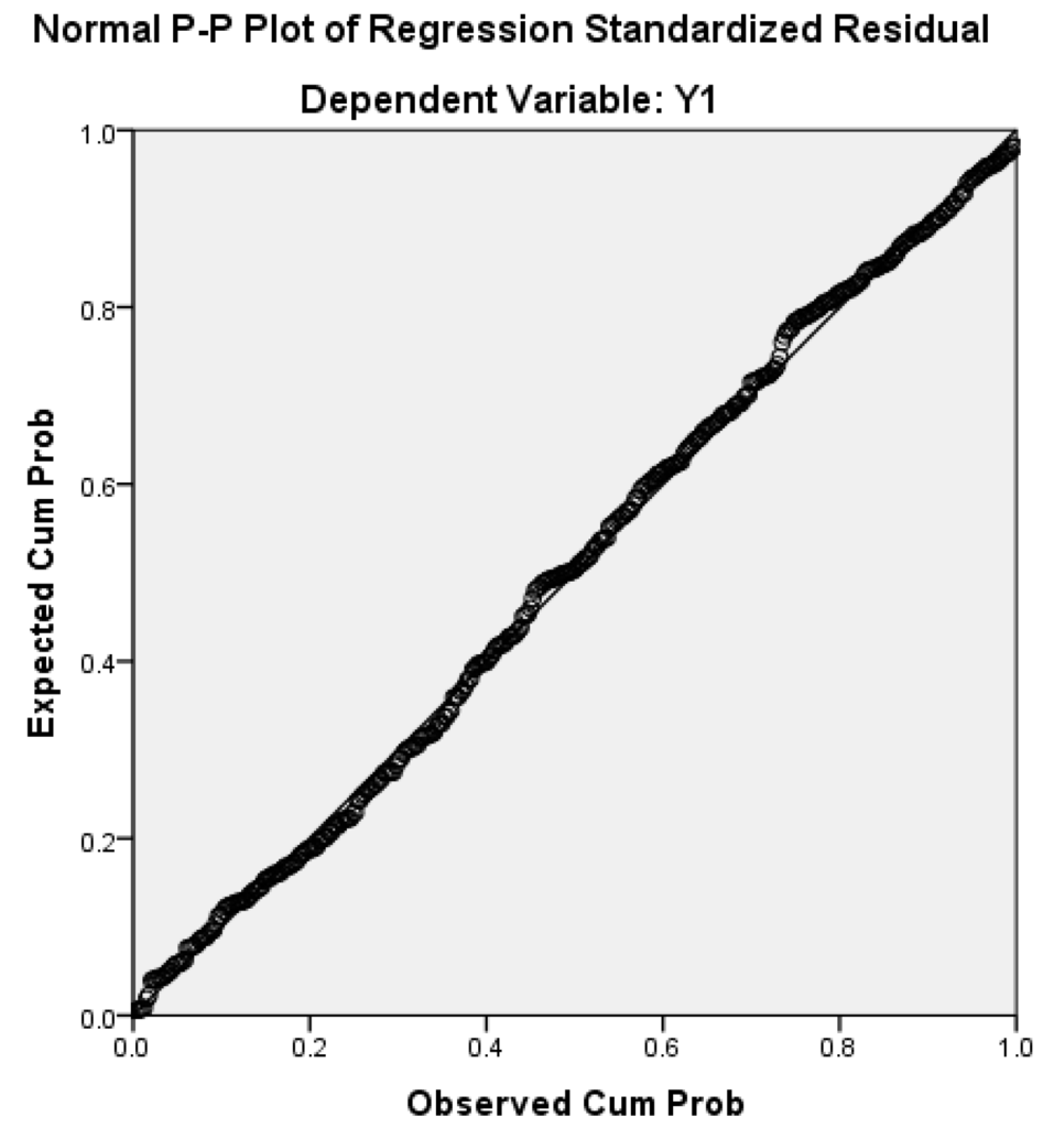 To check for meeting the assumption that the residuals or error terms are normally distributed, we look at the Normal P-P plot of Regression Standardized Residual as shown in Figure 15 below: