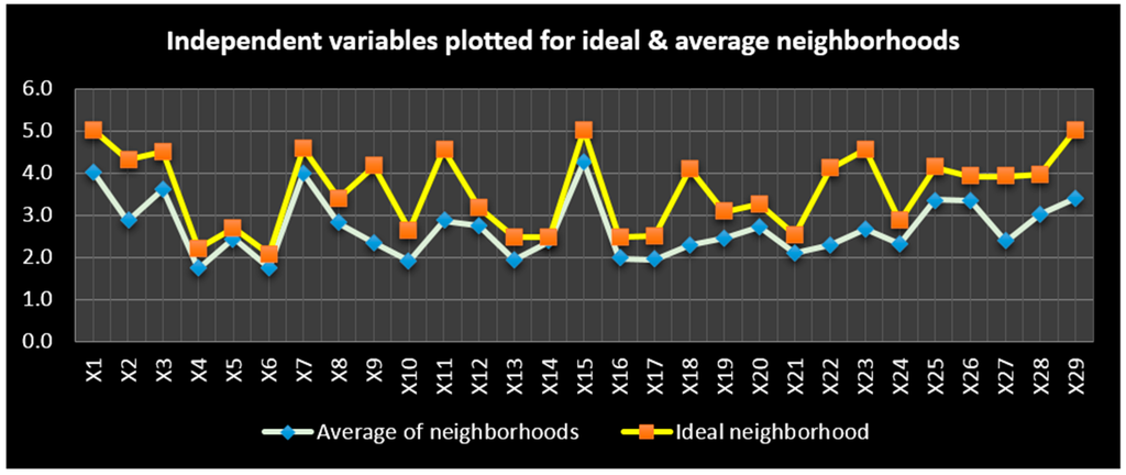 To understand the overall existing condition of the built environment in various neighborhoods of Nagpur using the 29 independent variables, it was essential to find average values for each variable in respect to all the 368 respondents data collected. The maximum average score mentioned below in Figure 17, were observed in each variable, which were considered as achievable benchmark scores in Nagpur city.