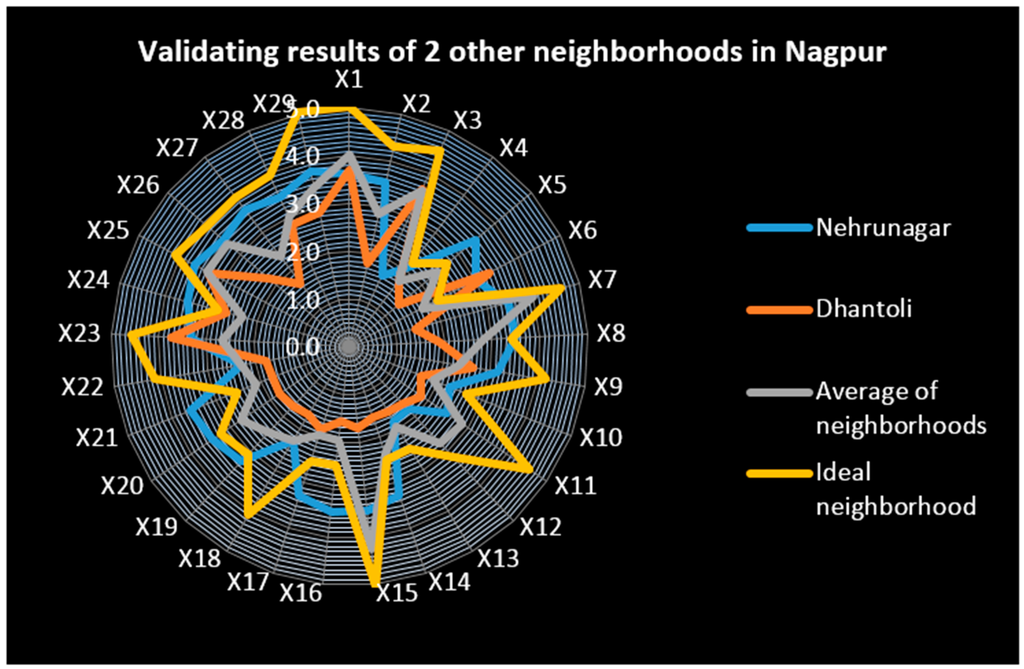 Figure 19 gives the cumulative picture of both the neighborhoods considered for validation and the values of the variables under study lie well within the rings of the average and the ideal values of variables under consideration for the city of Nagpur, which furthermore validates the appropriateness of the model for the urban neighborhoods to be studied and researched upon in the Indian context.