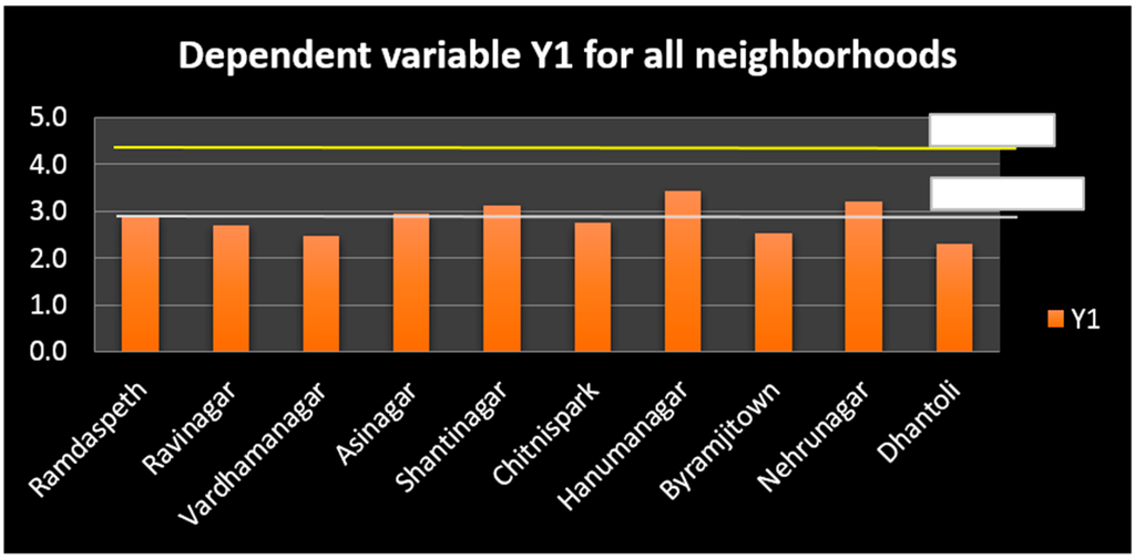 The two new neighborhoods studied were (Nehrunagar and Dhantoli) and their average values of variables were fitted in regression equation to get the value of Y1. Value of Y1 for Nehrunagar was found to be 3.2 and the value of Y1 for Dhantoli as 2.3 against the average Y1 of 2.9 from equation.