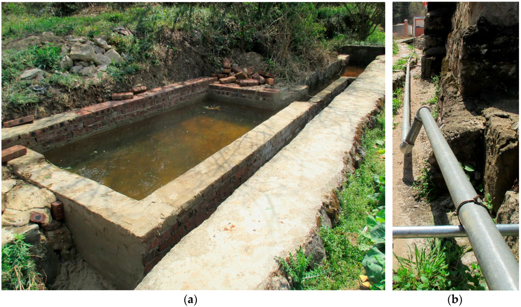Damoyu water systems: (a) agricultural irrigation tank; (b) domestic water supply pipe.
