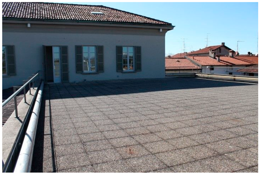 The terrace and the conference room located below the terrace underwent renovation from 2005–2007: therefore, the stratigraphy of the terrace meets the thermal insulation requirements of the national legislation in force at the moment of the renovation works [28], which does not substantially affect the monitored thermal behavior of the experimental set-up.