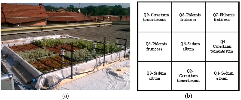 The area is divided into nine plots (1 m × 1 m): in order to validate the monitoring measurements, each plant species was planted three times in three different plots (Figure 2). Forty, 30, and 20 plants were planted for Sedum, Cerastium, and Phlomis, respectively, in order to partially cover the nine plots, awaiting the full potential development.