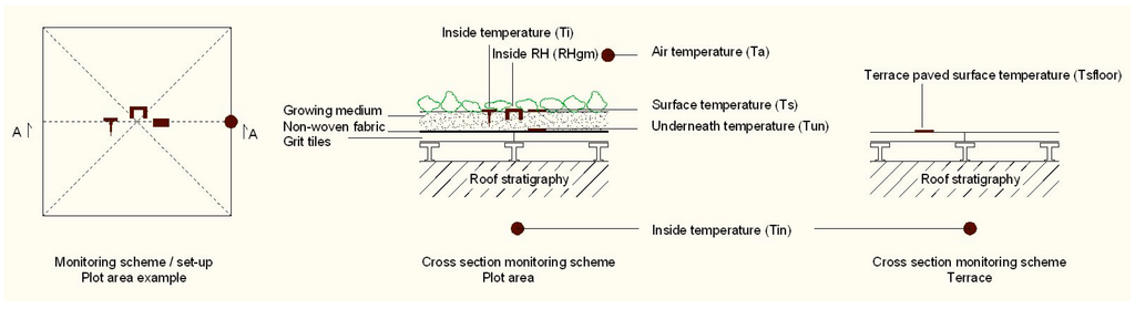 A surface temperature sensor installed on the flat roof (Tsfloor), on which the experimental area was set up was added, to allow comparisons with the vegetative surfaces data (Figure 4).