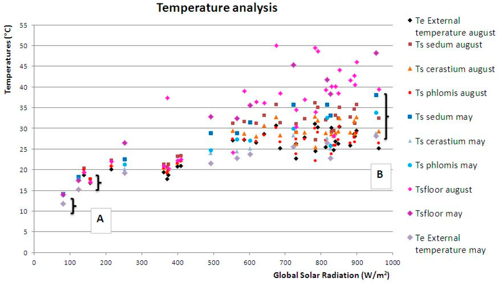 The surface temperatures of the plant species (Ts) differ from the external temperature (Te) with a thermal gradient on average lower than 5 °C (‘A’ data in Figure 6) for low values of solar radiation (I < 500 W/m2). Therefore, surface temperatures of the plant species (Ts) differ from the external temperature (Te) with thermal gradients comprised between 15 °C and 20 °C (‘B’ data in Figure 6) for high values of solar radiation (I > 500 W/m2).